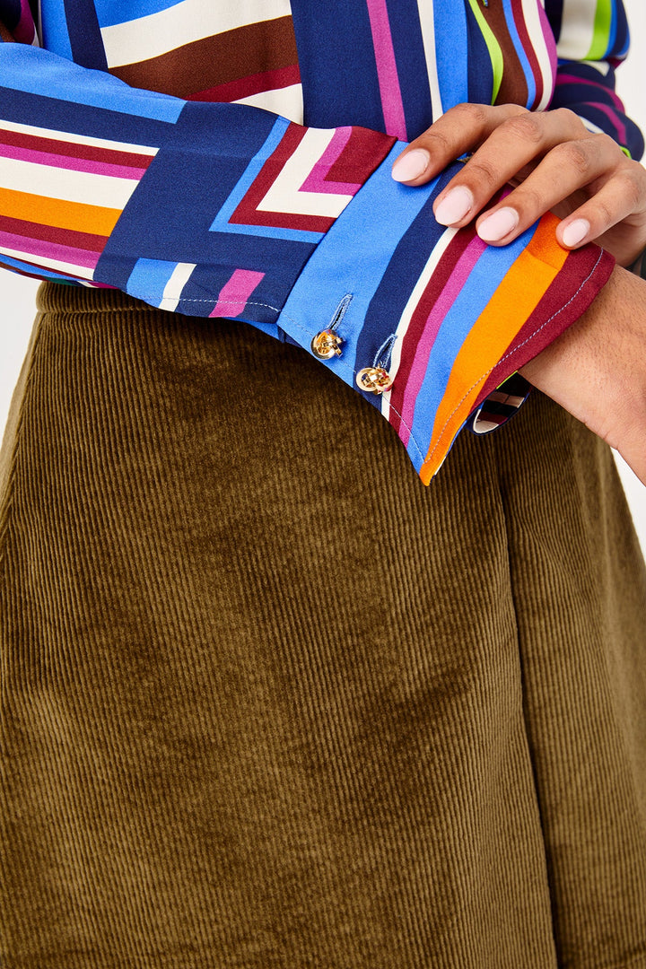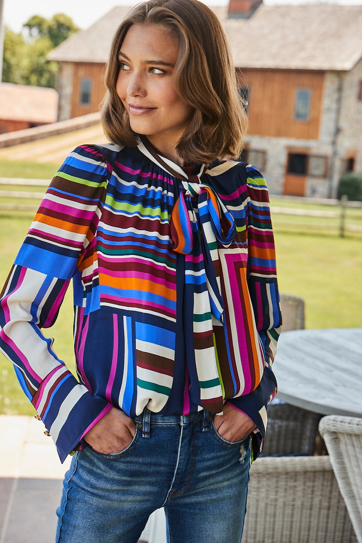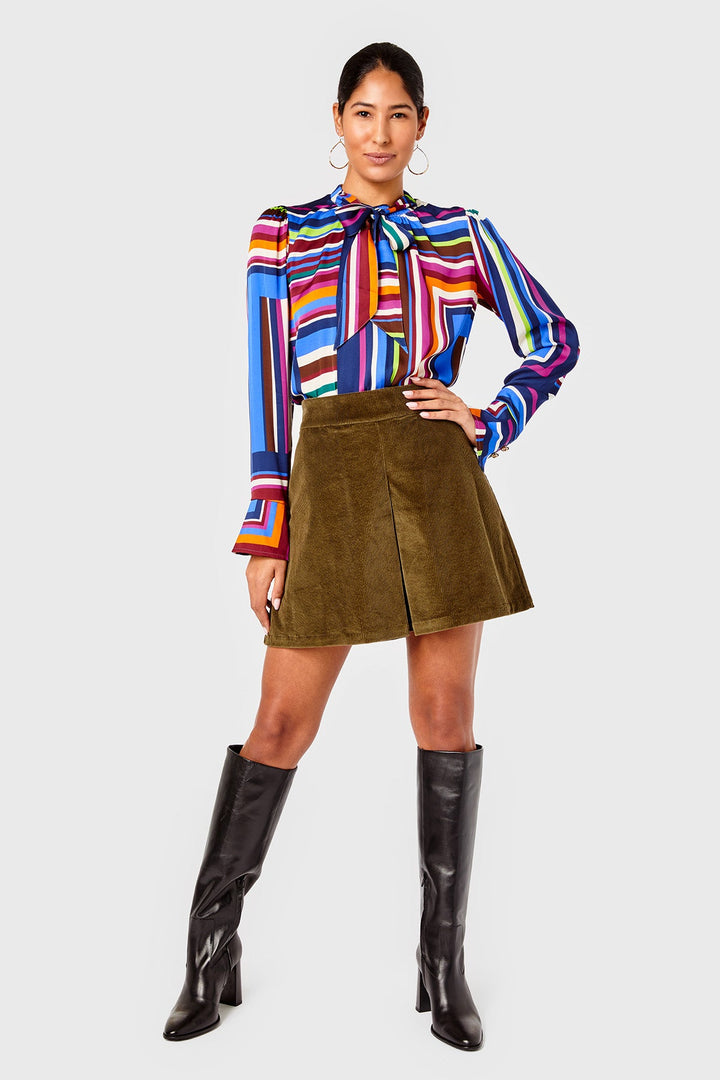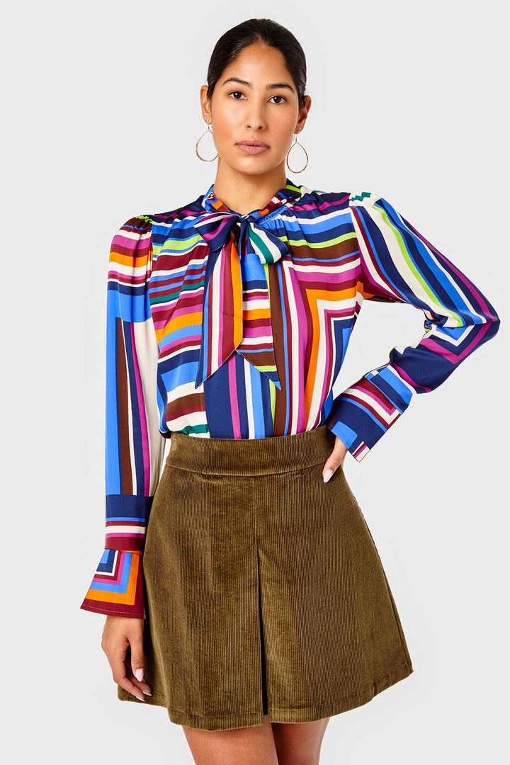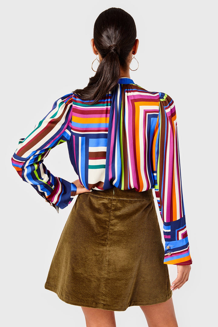 A luxe silk blend with stretch makes this blouse simultaneously gorgeous and comfortable. This vibrant and bold print will certainly make a statement and can be paired with any skirt, leather bottom or jeans. Features a shirred, elastic neckline with a bow and stunning gold braided button cuffs - beauty is in the details. Shirred, elastic neckline Bow closure in front Gold braided button cuffs