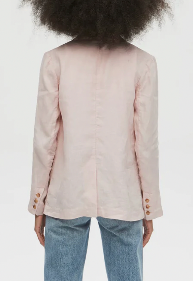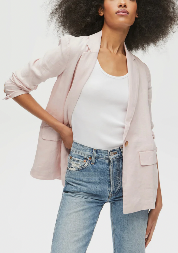 Menswear inspired lightweight linen jacket blazer. Classic fit with front pockets and button closure. A great elevated layering piece in the warmer months.