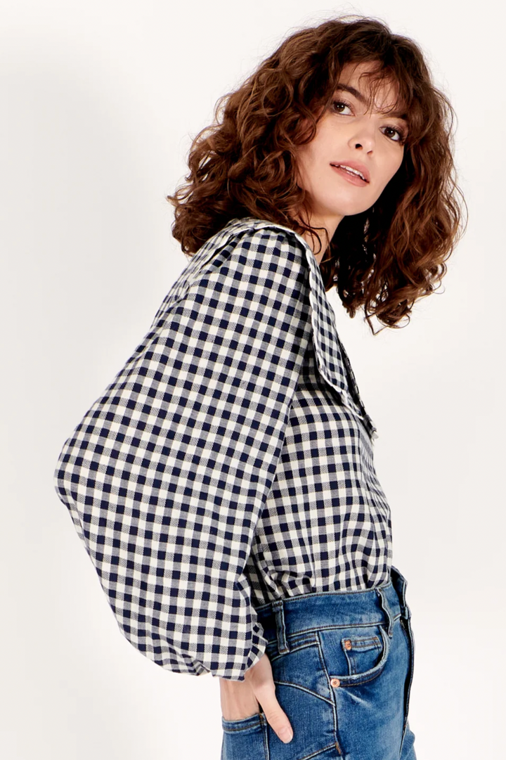 Introducing our Mabel Gingham Top! This bib-like top is the perfect addition to your wardrobe, elevating any outfit with its bespoke chequered design in deep navy. Versatile and stylish, pair it with jeans, trousers, or skirts for a chic and effortless look.