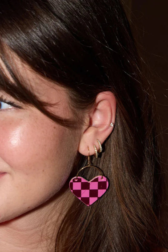 Add a touch of love and style to any outfit with The Lover earrings. Handmade with magenta checkered foil print and shimmer magenta leather, these bold heart-shaped earrings are sure to make a statement. Elevate your look with their unique blend of romantic charm.