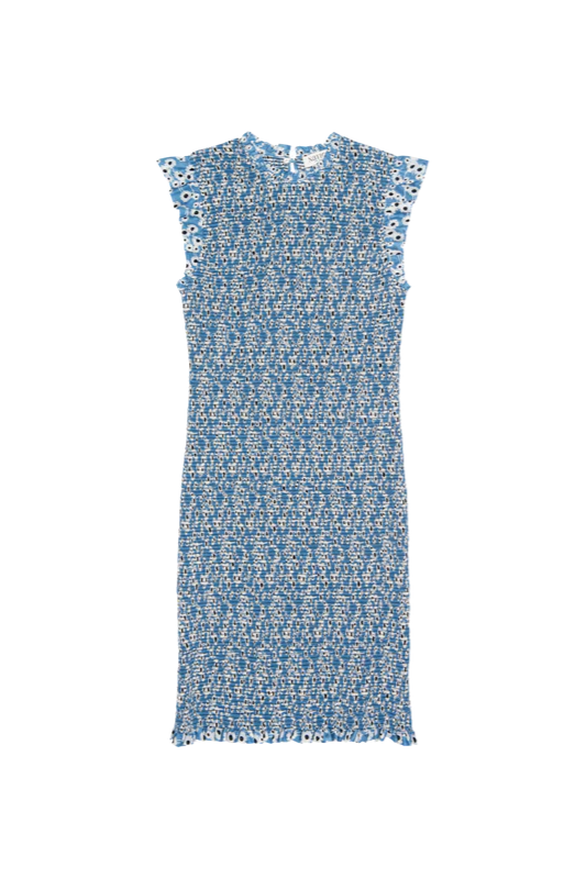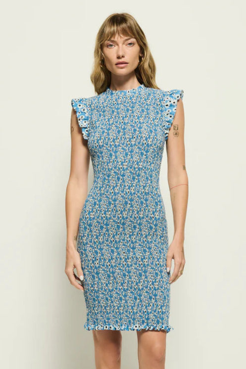 Indulge in confidence with our Marlene Smocked Dress in Blue Hazy Daisy. Made from premium Pima Cotton, this form-fitted mini boasts a ruffled flutter sleeve, smocked bodice, and keyhole detailing with button closure. Stand out with the vibrant, feminine design while feeling comfortable and stylish.