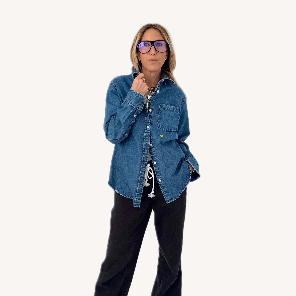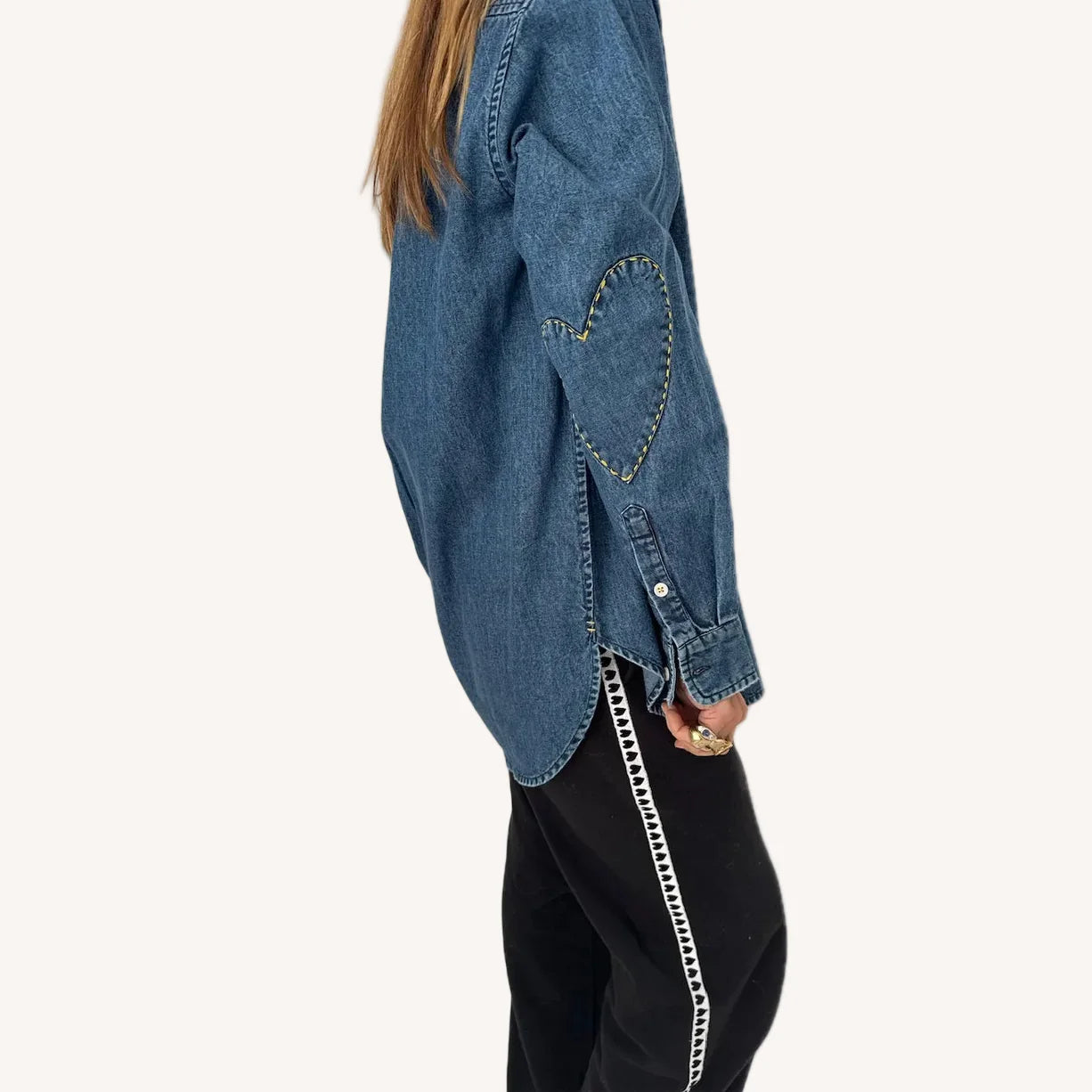 The Mia Denim Shirt is a thoughtfully designed piece that balances effortless style with intentional detail. Crafted from 100% cotton denim, it features a slightly oversized silhouette that feels modern and relaxed. The butter-soft fabric has been perfectly distressed in strategic places, while hand-stitched yellow Imperfect Heart patches at the elbows add a signature touch of personality. A single chest pocket and button-down front complete the classic shirt construction. Made in India with meticulous craftsmanship, this is the denim shirt that transcends trend—versatile enough for layering or wearing solo, refined enough to anchor any casual wardrobe.