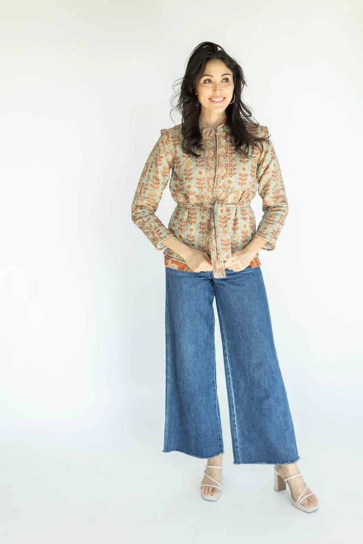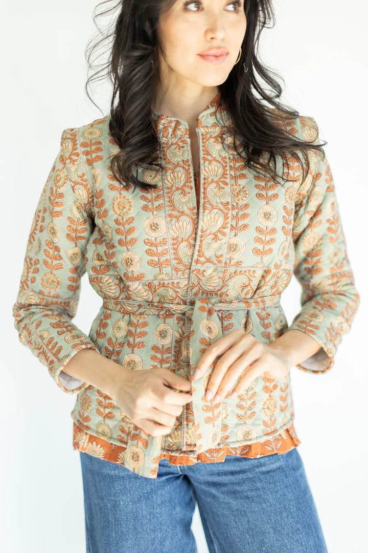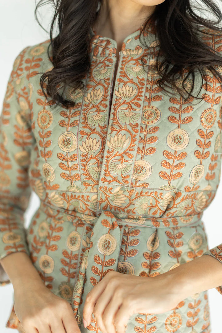 Introducing the Mia Jacket- Woodsmoke. Hand-blocked by artisans in Jaipur, this newest fall jacket features a quilted material, contrasting trim, matching belt, and mandarin collar for a unique and stylish look. Stay warm and stylish with 100% cotton and a flattering fit. Hand wash for easy care.