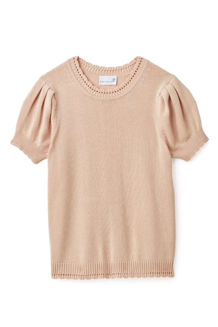 The Michaela Sweater in Champagne is your new go-to for effortless charm. Light and airy, it features soft pleated sleeves that dance with every move and scalloped edges that add a touch of whimsy. Crafted from a lightweight cotton blend, it offers a smooth, comfy fit perfect for layering any day of the week. Embrace delicate details with a playful twist!