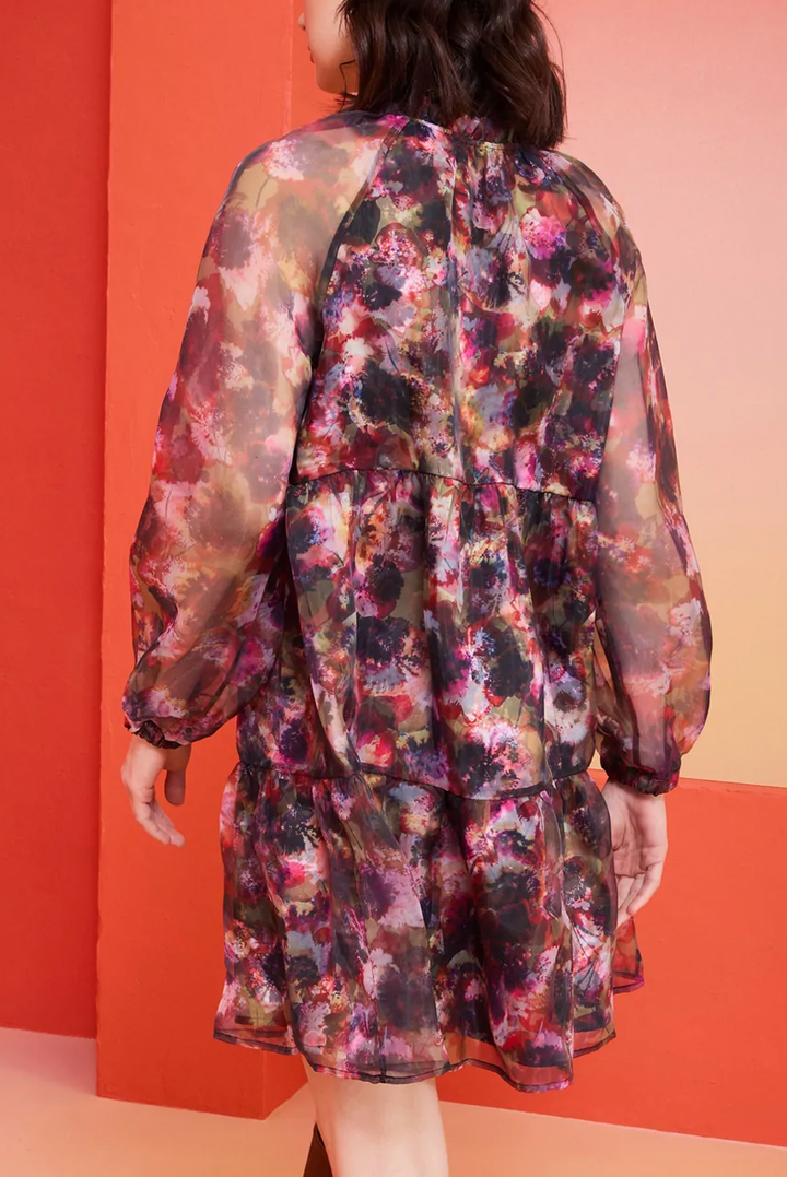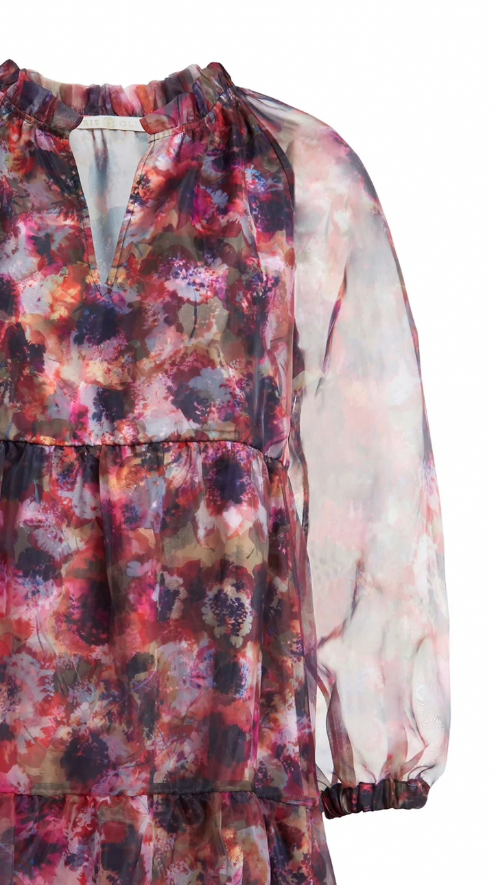 A-line figure flattering silhouette with an organza top layer and sheer sleeves. Leave the split neckline open or hooked. **FINAL SALE**