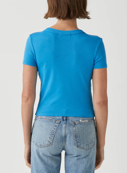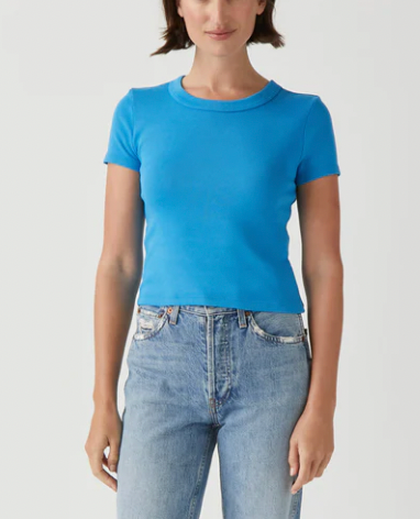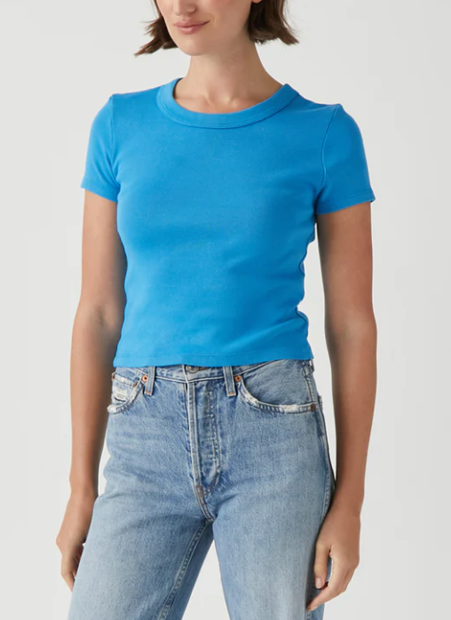 Not too long and not too short. We love this basic cropped tee with its high crew neckline, short sleeves and body skimming silhouette. The perfect length for your mid to high rise bottoms. We love this bright blue color paired with white denim.