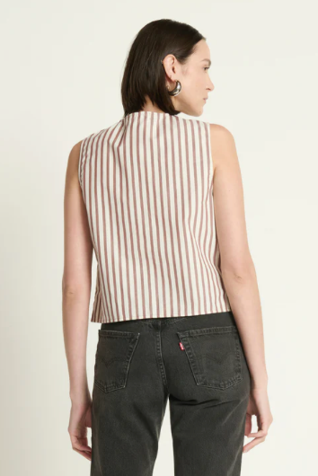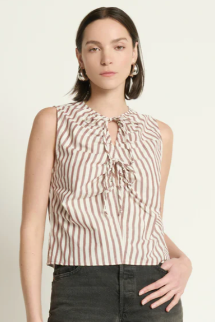This sleeveless Mimmi Keyhole Top in Sable Stripe is your new favorite for everything from girls’ night out to brunch with the crew. Made from our midweight Paper Touch Cotton Poplin, it combines comfort with a fun tie-front detail for an effortlessly cool vibe. Easy to wear and impossible to ignore, it’s the perfect pick for playful, stylish moments.