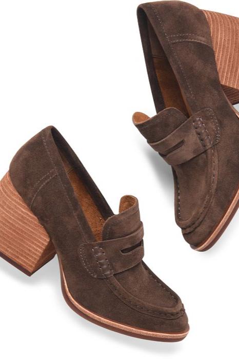 Introducing the Modeste Suede High-Heel Loafer in Dark Brown! With a comfortable chunky heel and timeless loafer style, these shoes are both stylish and practical. The suede leather and breathable soft micro suede lining ensure maximum comfort, while the high-traction rubber outsole provides stability. Standing at 3" tall, these heels will elevate any outfit. (Sole-ful and stylish, these loafer heels take comfort and chicness to new heights!)