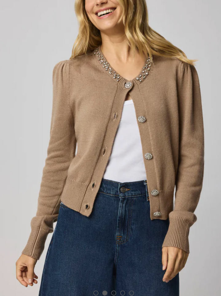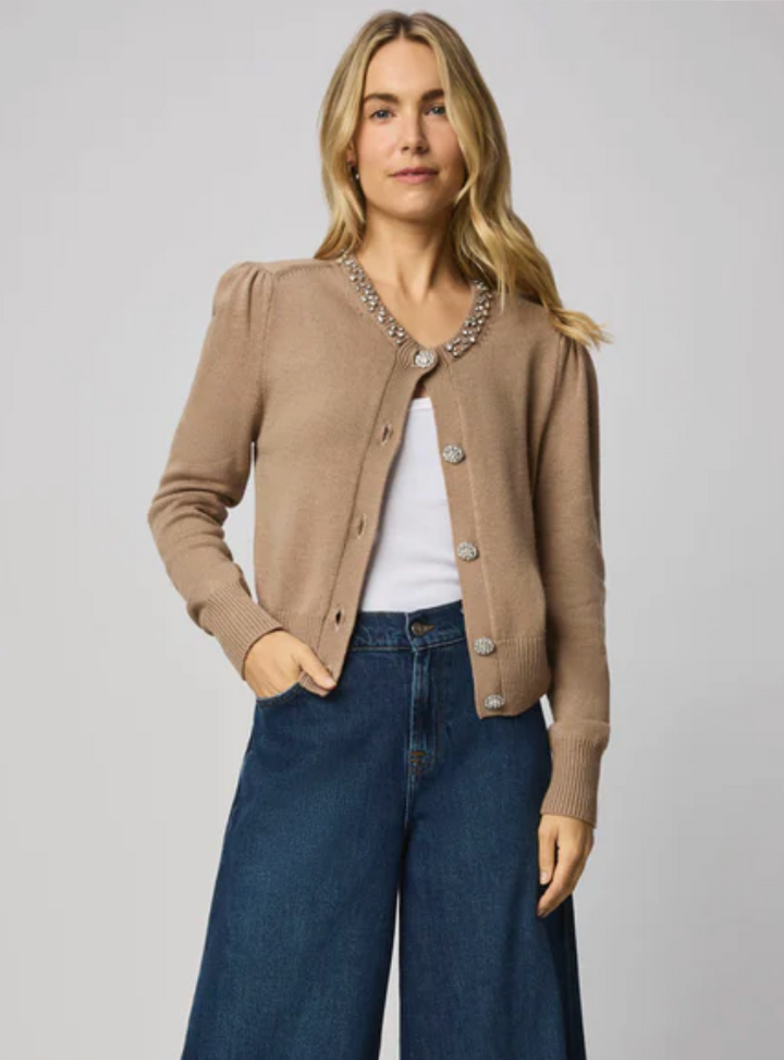 Introducing the Montana Cardigan—where everyday elegance meets playful sophistication. This luxe layer features a show-stopping jeweled neckline and crystal buttons that catch the light beautifully. Crafted from soft, midweight knit with charming puff sleeves and a flattering cropped silhouette, it's the perfect excuse to dress up your casual moments. Slip it on and watch your whole outfit transform. Because sometimes the best accessories are the ones you can actually wear.