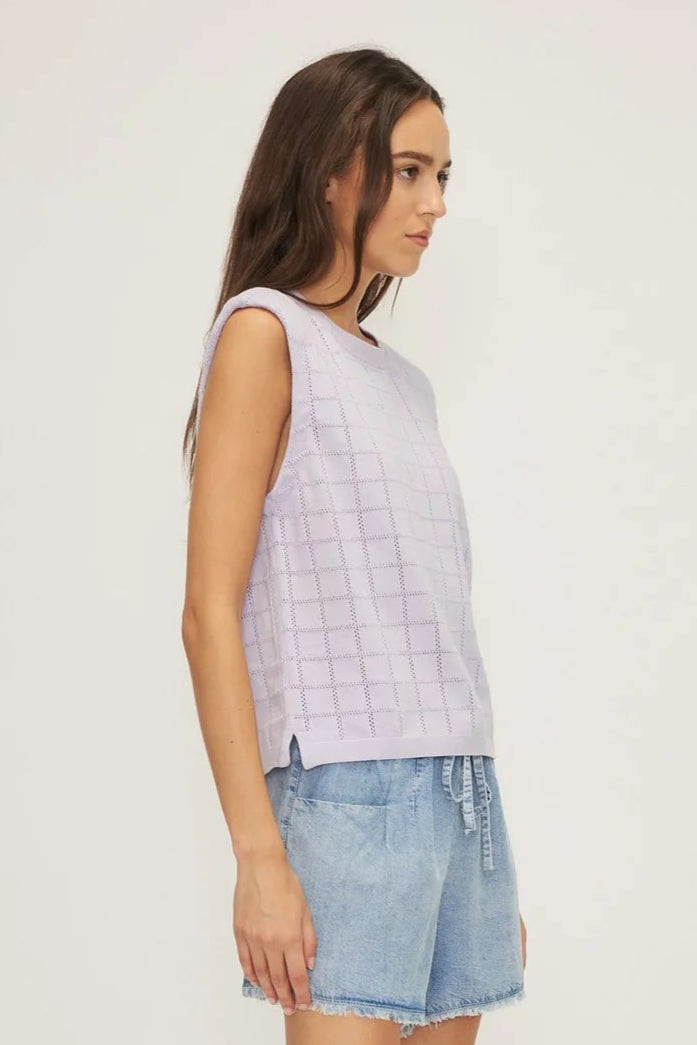 The Moris Top in Lavender presents a refined interpretation of the muscle tee silhouette, distinguished by its meticulous grid knit pattern. This elevated essential showcases a delicate light purple hue that enhances its sophisticated appeal. The precision-engineered construction delivers a contemporary aesthetic while maintaining exceptional versatility for the modern wardrobe connoisseur.
