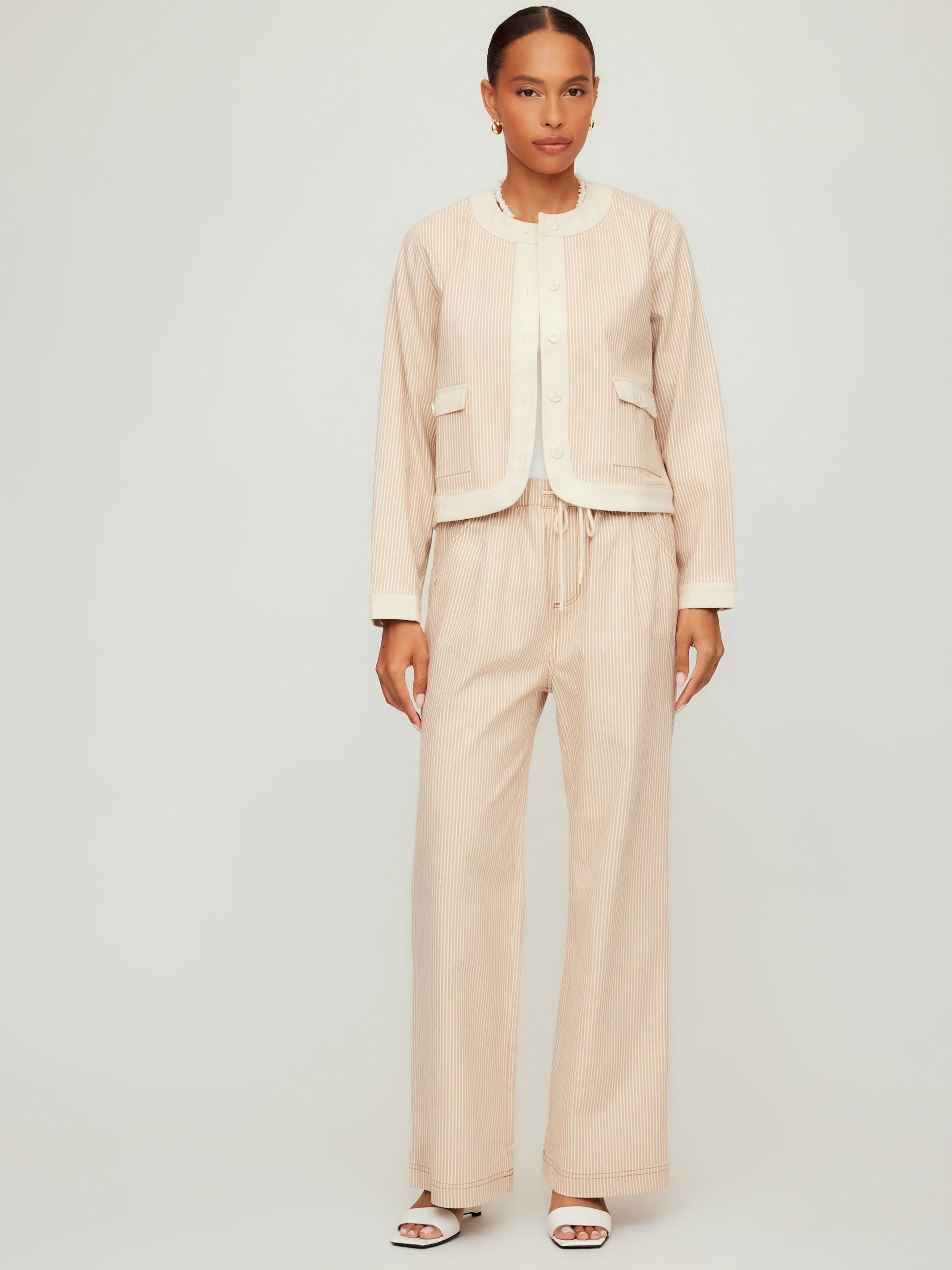 The Myra Contrast Cropped Jacket delivers understated sophistication through thoughtful design details. Its yarn-dyed striped construction in khaki and cream creates visual depth while remaining versatile enough to layer over basics or dresses. The cropped cut pairs effortlessly with high-waisted denim or trousers, while contrast trim at the neckline, cuffs, and hem adds a polished edge. Button-front closure and functional flap pockets balance structure with practicality—ideal for transitional seasons when you need layering that doesn't overwhelm.