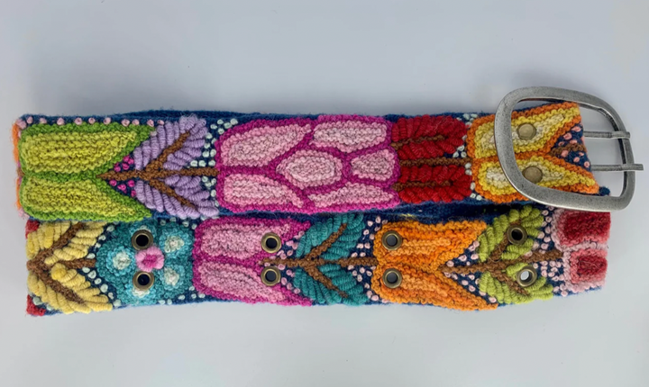 Navy hand loomed wool fabric provides the perfect backdrop for bright florals and leaves. Hand embroidered by fair trade artisans in the Andes Mountains of Peru.