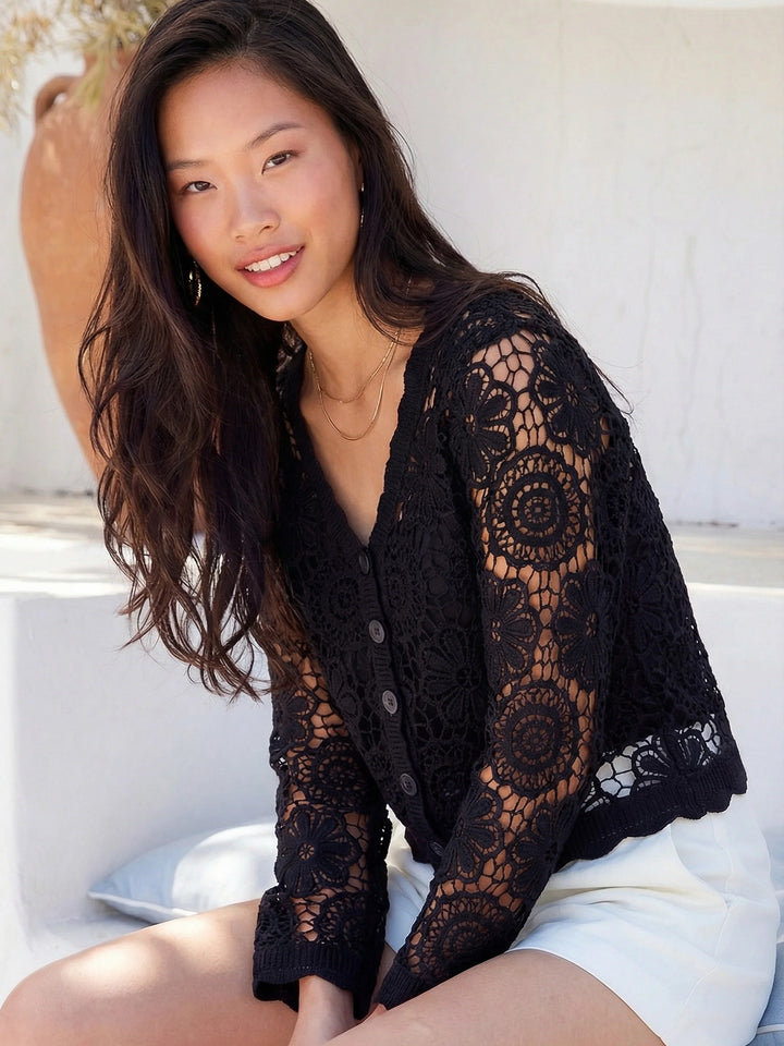 Nelly Crochet Soft Jacket in Black The Nelly Crochet Soft Jacket delivers understated sophistication through thoughtful design. Its intricate crochet construction creates a semi-sheer aesthetic that works beautifully as a layering piece or standalone statement. The feminine V-neckline and long sleeves offer refined proportions, while front button closures provide practical styling flexibility. Lightweight and breathable, this jacket transitions seamlessly from season to season, making it an essential addition to a curated wardrobe.