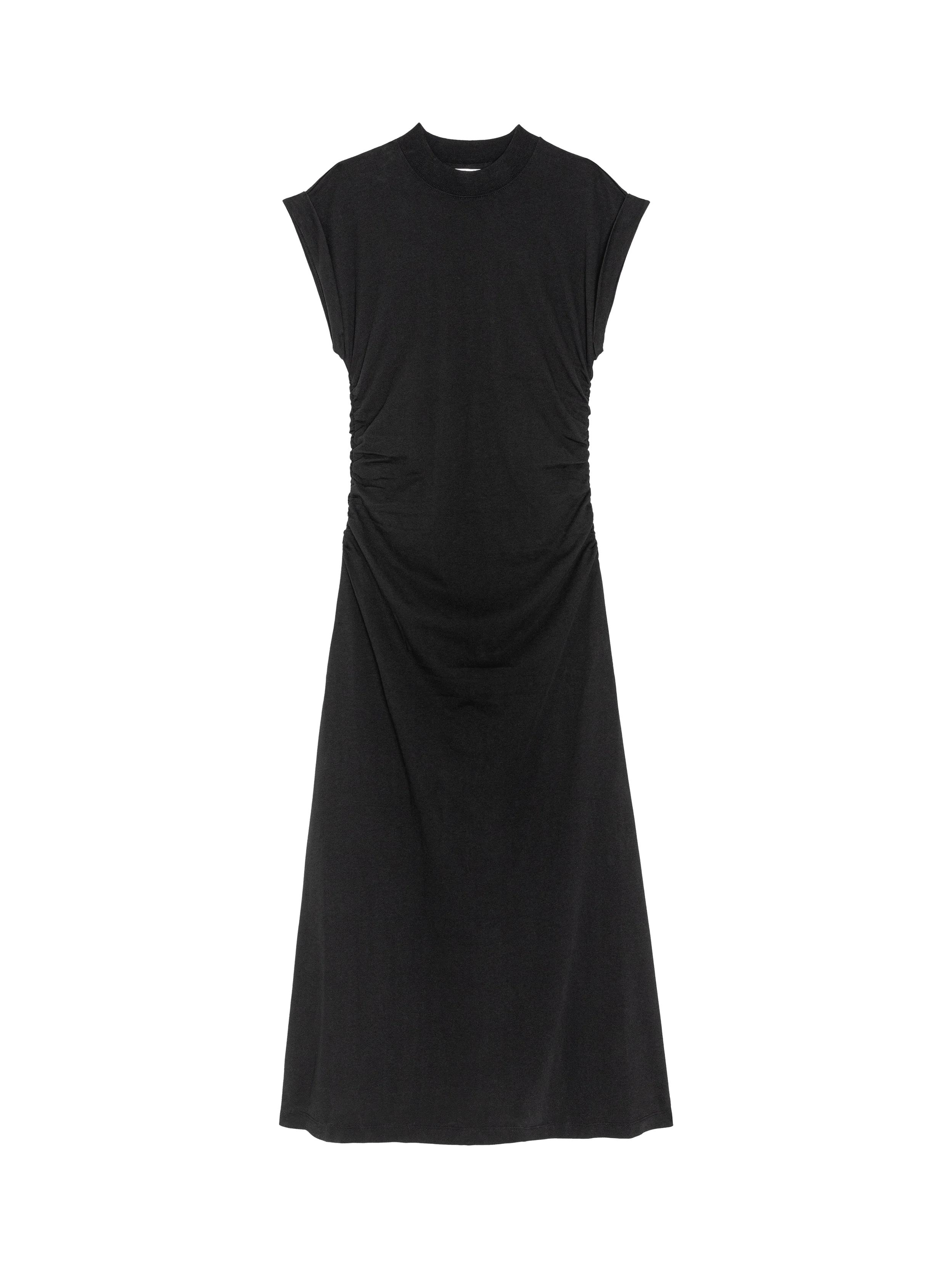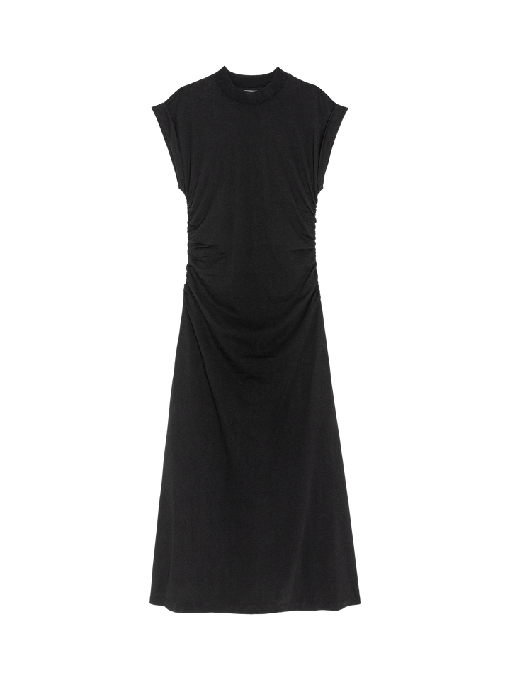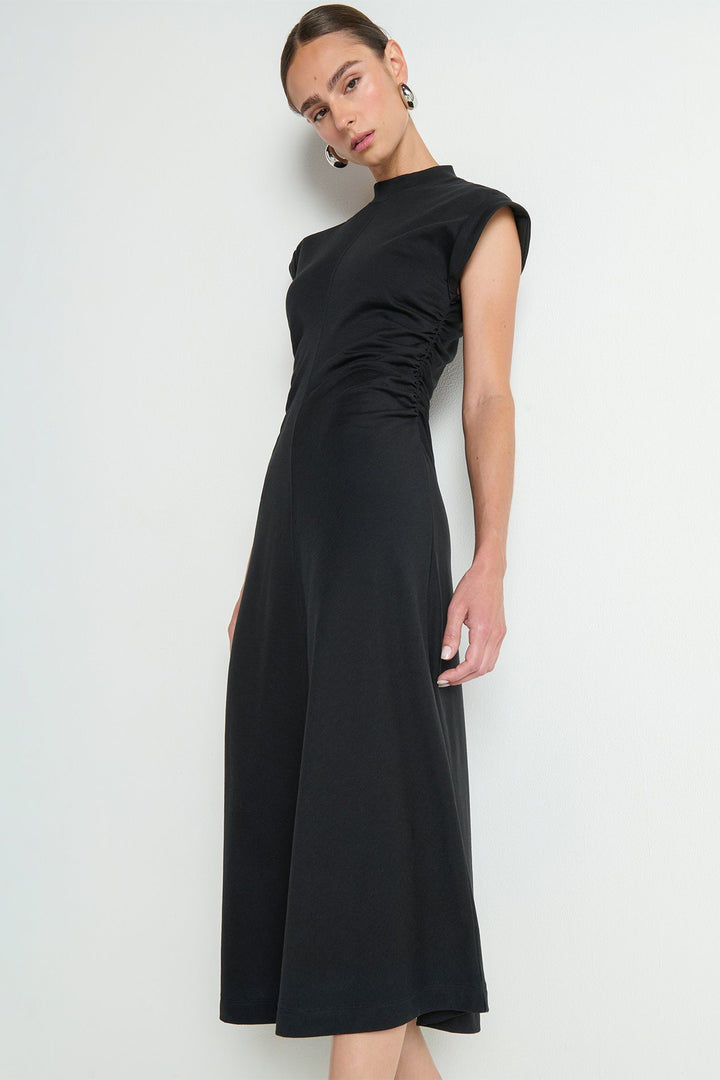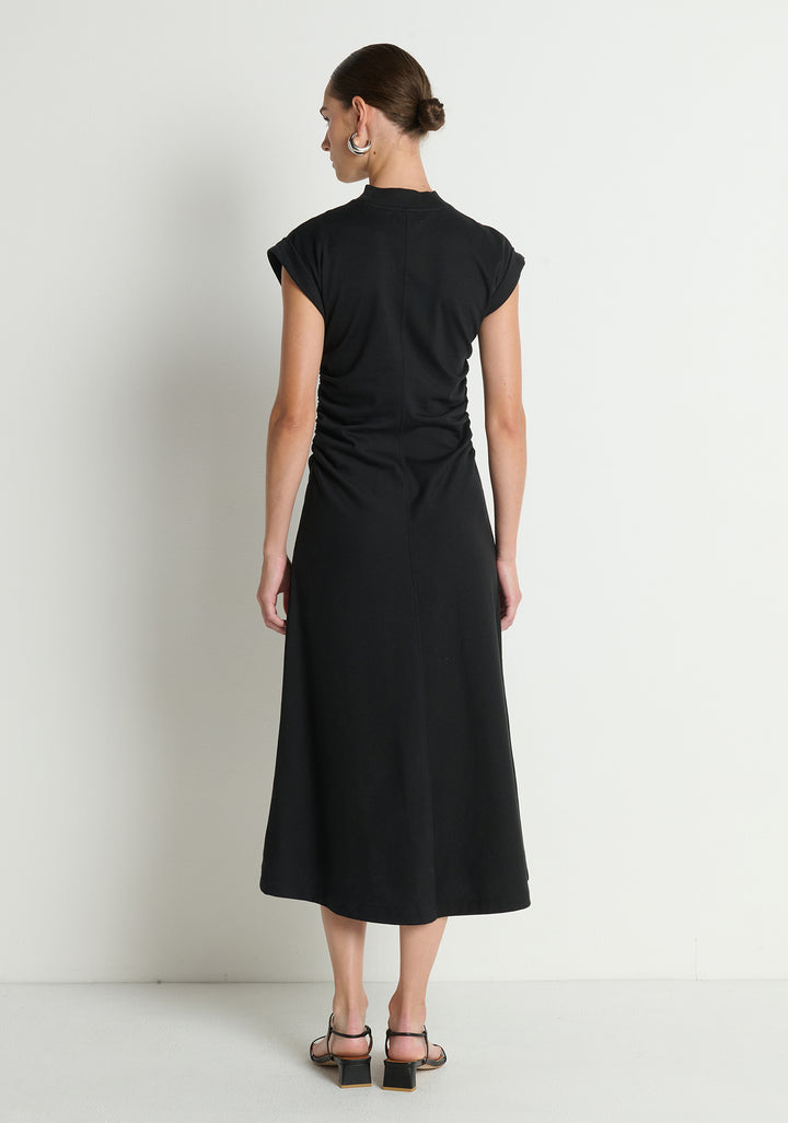 The Neva Dress in Jet Black delivers quiet sophistication for moments that matter. Crafted from a fluid knit fabric, it drapes with intention while its A-line silhouette skims the body for a refined, flattering fit. The mock neck and dropped shoulders introduce subtle design details that elevate the piece beyond basics. Versatile enough for professional settings or elevated casual wear, this is the dress you'll reach for when understated elegance is the only option.