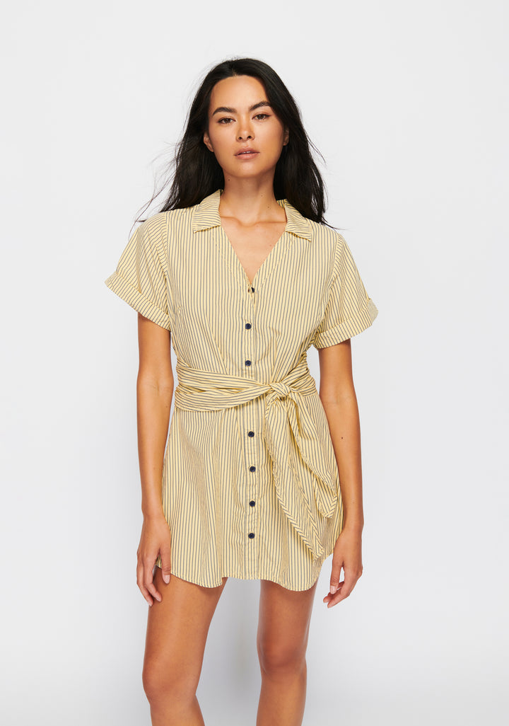 Effortlessly chic and stylish, the Nida Wrapped Button-Up Dress features a relaxed open collar and boxy short sleeves. The adjustable tie at the waist allows for a perfect fit. This great day dress is designed in a muted yellow hue with navy stripes, making it a versatile and on-trend addition to any wardrobe.