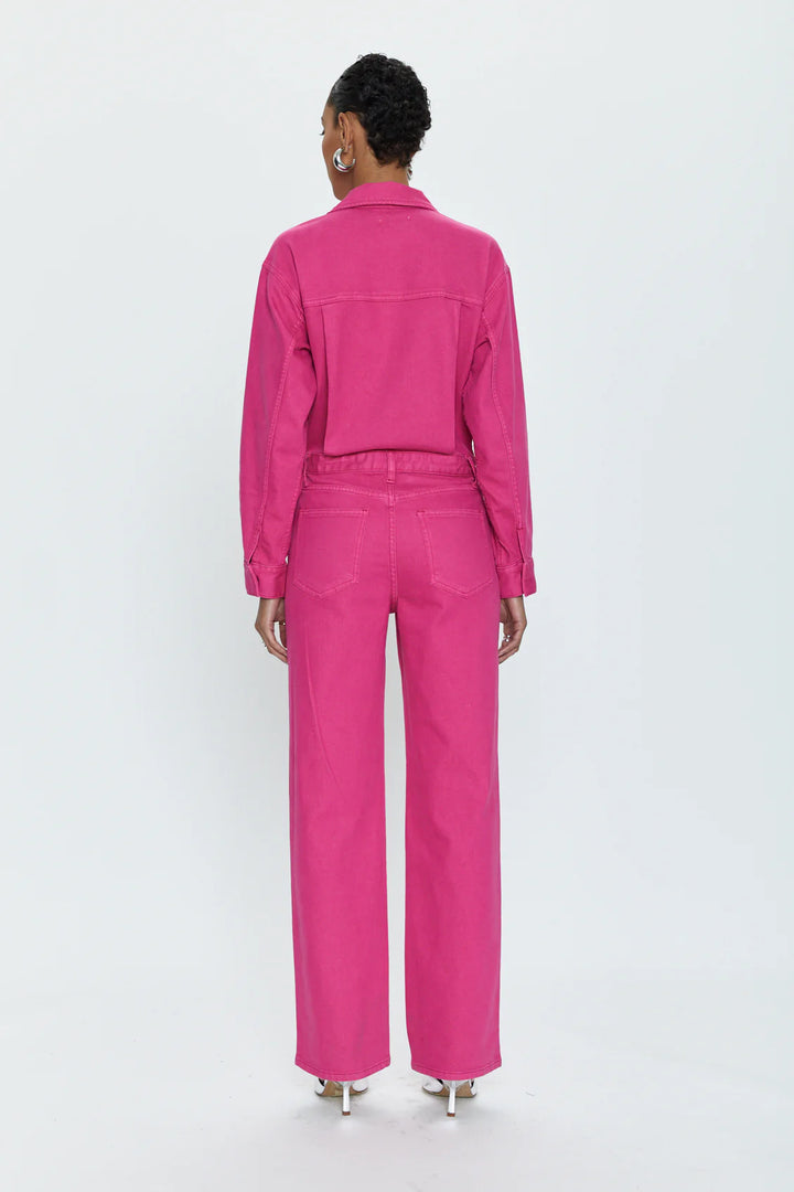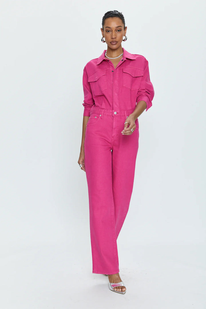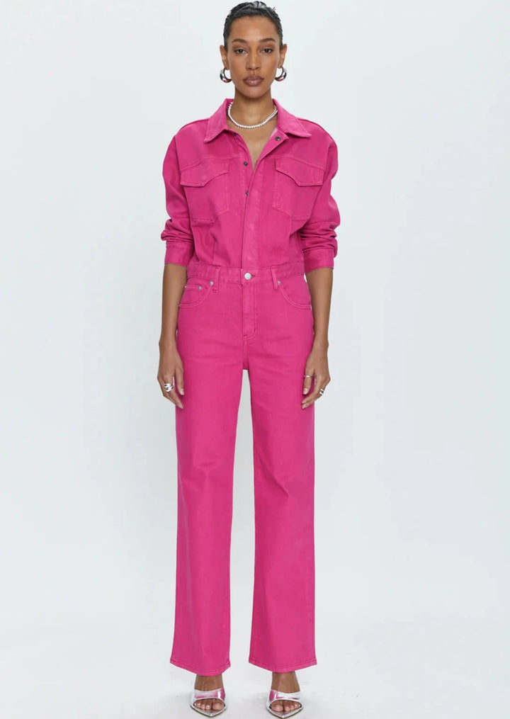 Make a statement in our Nikki Jumpsuit- Pink Garnet. This one-piece style looks just like two and comes in a bright pink hue for a show-stopping look. Enjoy no-stress styling: pair with a belt or wear alone. This jumpsuit also features a snap front closure with zippered fly for an extra element of style. Dress it up or down for any special event. Experience effortless elegance with Nikki!