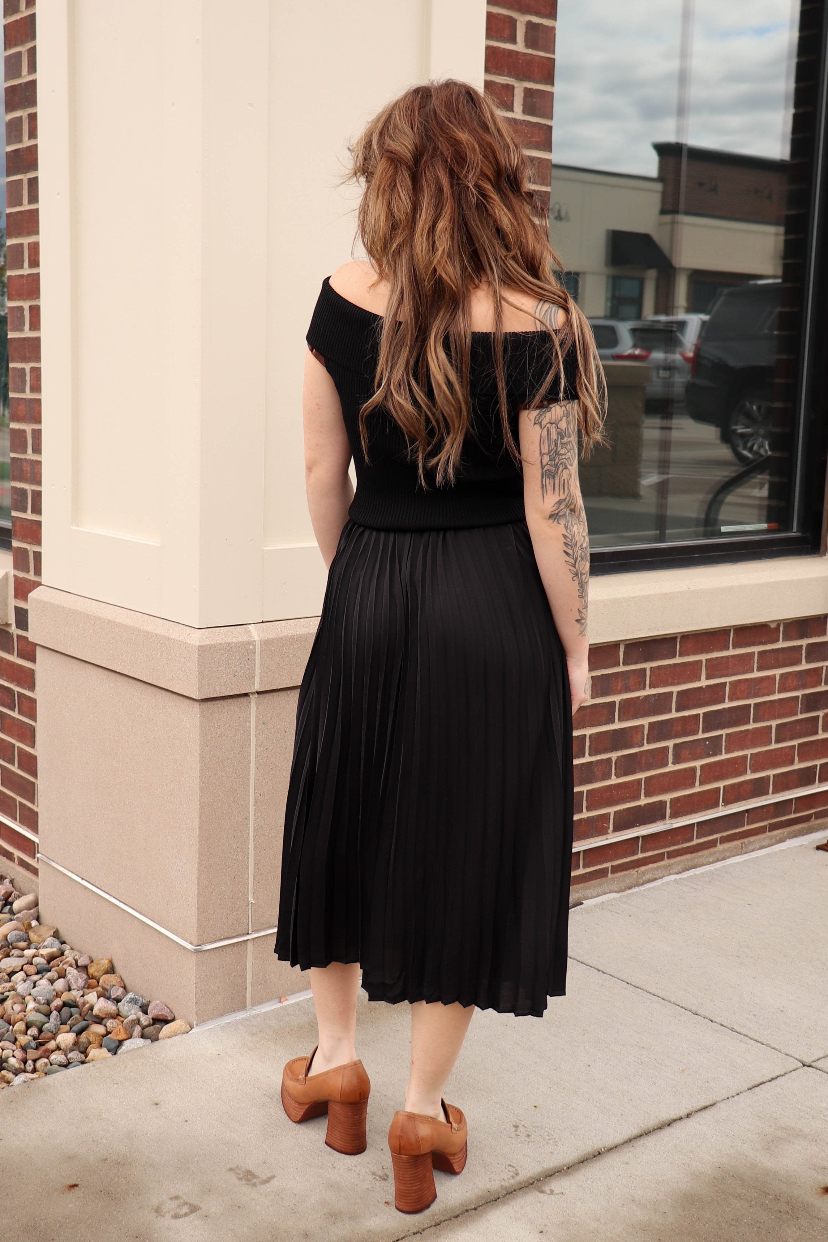 This off the shoulder midi dress is the perfect mix of style and comfort. Made with a blend of fabrics, it's both versatile and chic. Show off your shoulders with this dress that hits at midi-length. True to size.
