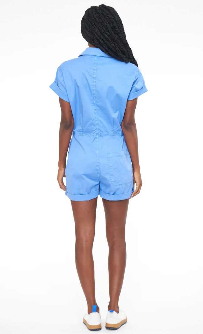 The short version of the best selling Grover jumpsuit is created for when you want to get a good tan. With a button front closure, chest pockets and straps along the waist to define it, every detail was thought of. We love this new bright blue color for summer! Pair with sneakers, sandals or wedges. 2.5" inseam when cuffed.