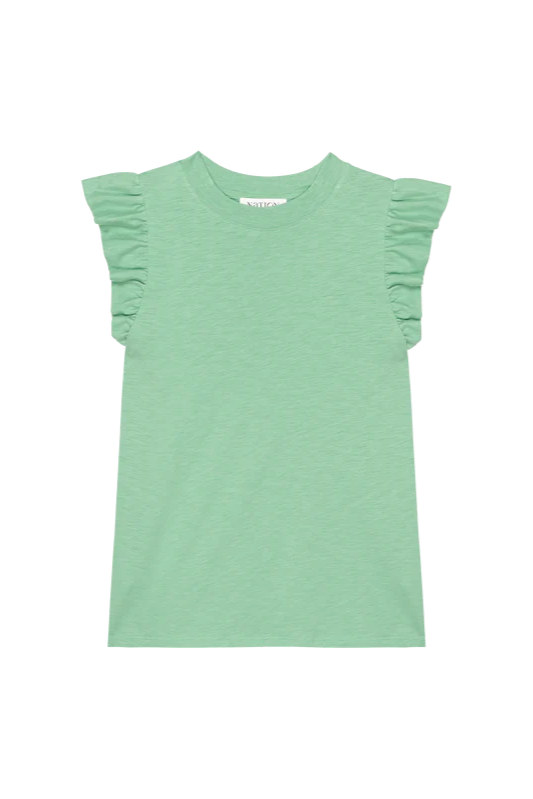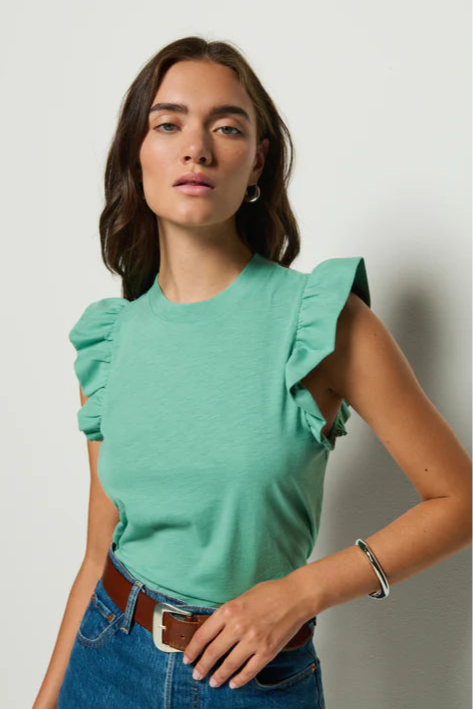 Effortlessly elevate your style with the Paulette Tank in Green Stone. This ruffle tank isn't your ordinary one - the lightweight fusing adds a touch of chicness while accentuating your waist for a flattering silhouette. Step up your wardrobe game with this must-have piece.