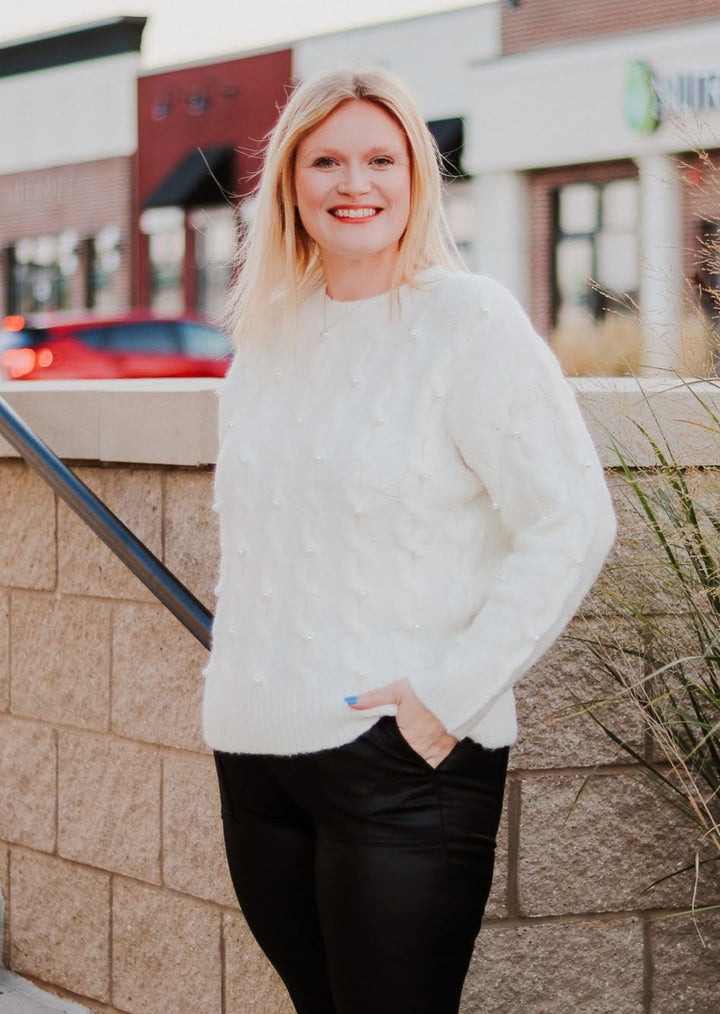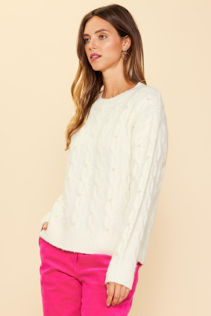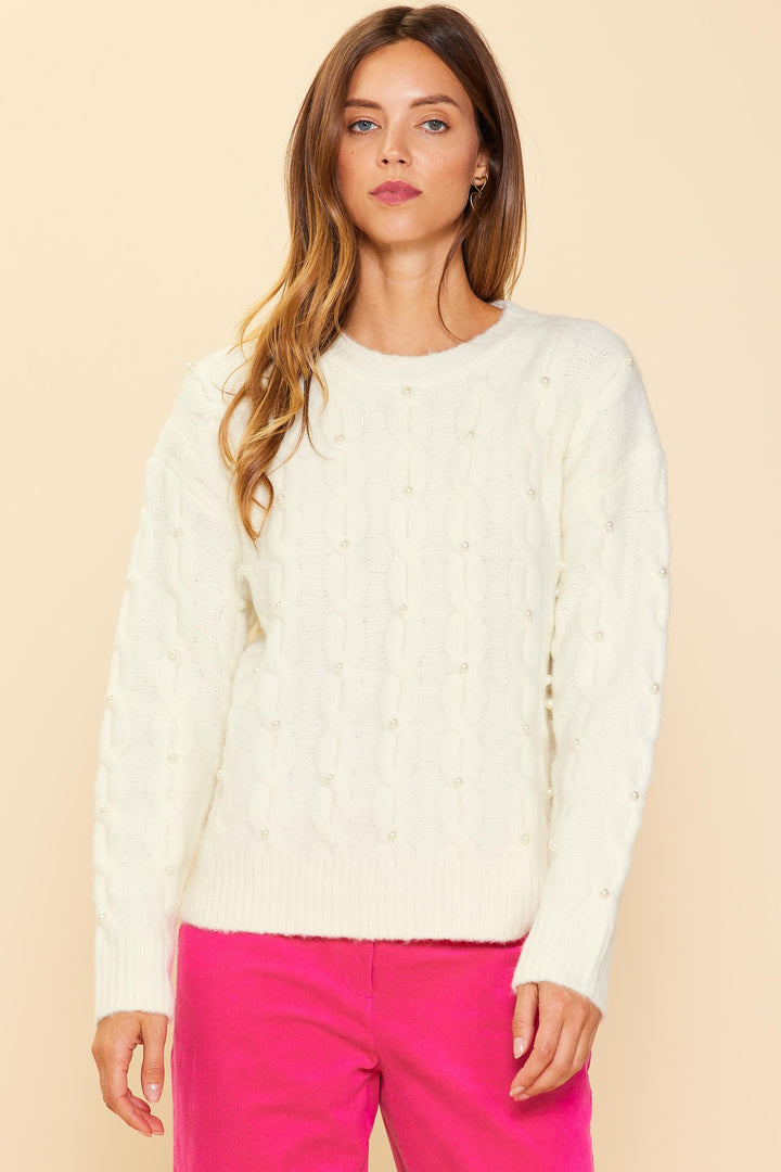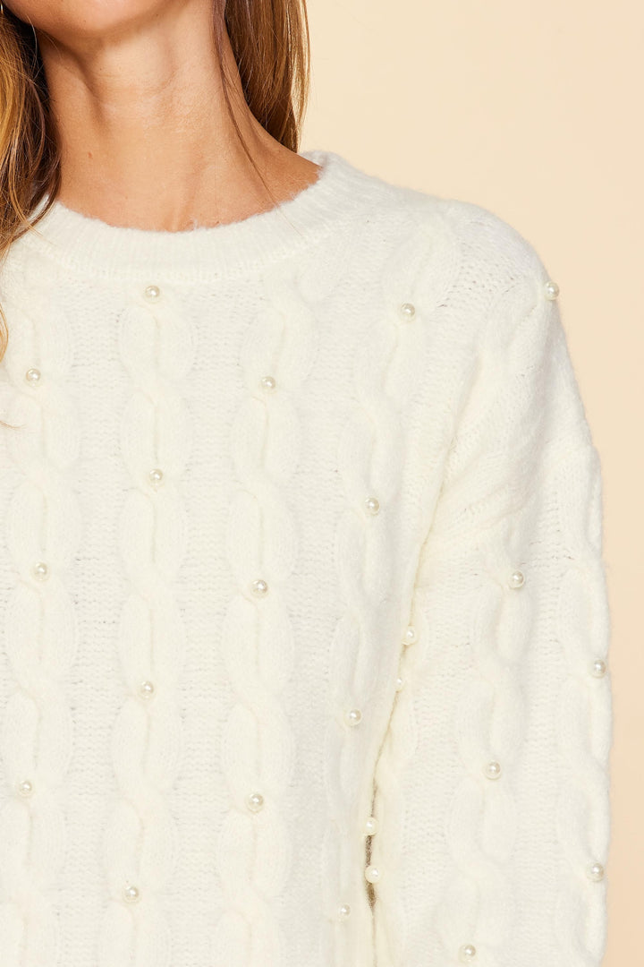 Pearl Detail Cable Knit Sweater- Cream**Final Sale**