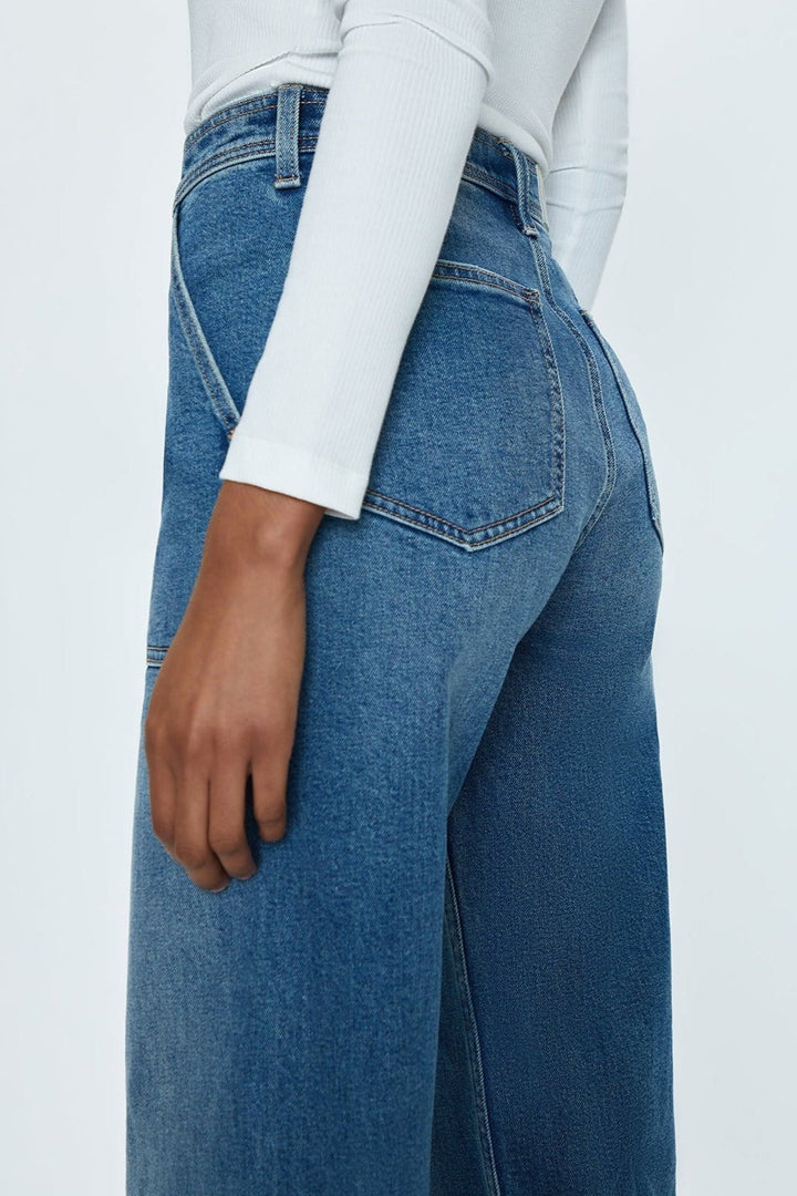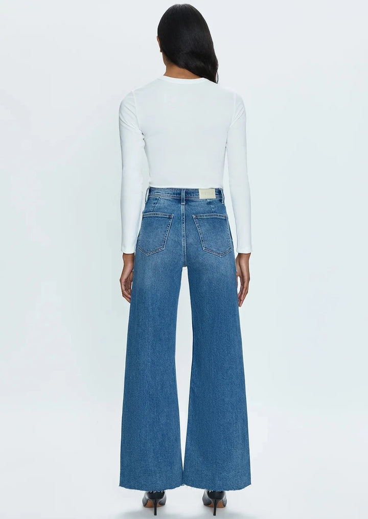High rise waist, with a wide leg silhouette, front patch pockets and a full length hemline. Crafted from their signature comfort stretch denim, with a double stitched waistline and scissor cut hems. Canal is a vibrant, medium blue denim wash with moderate fading.