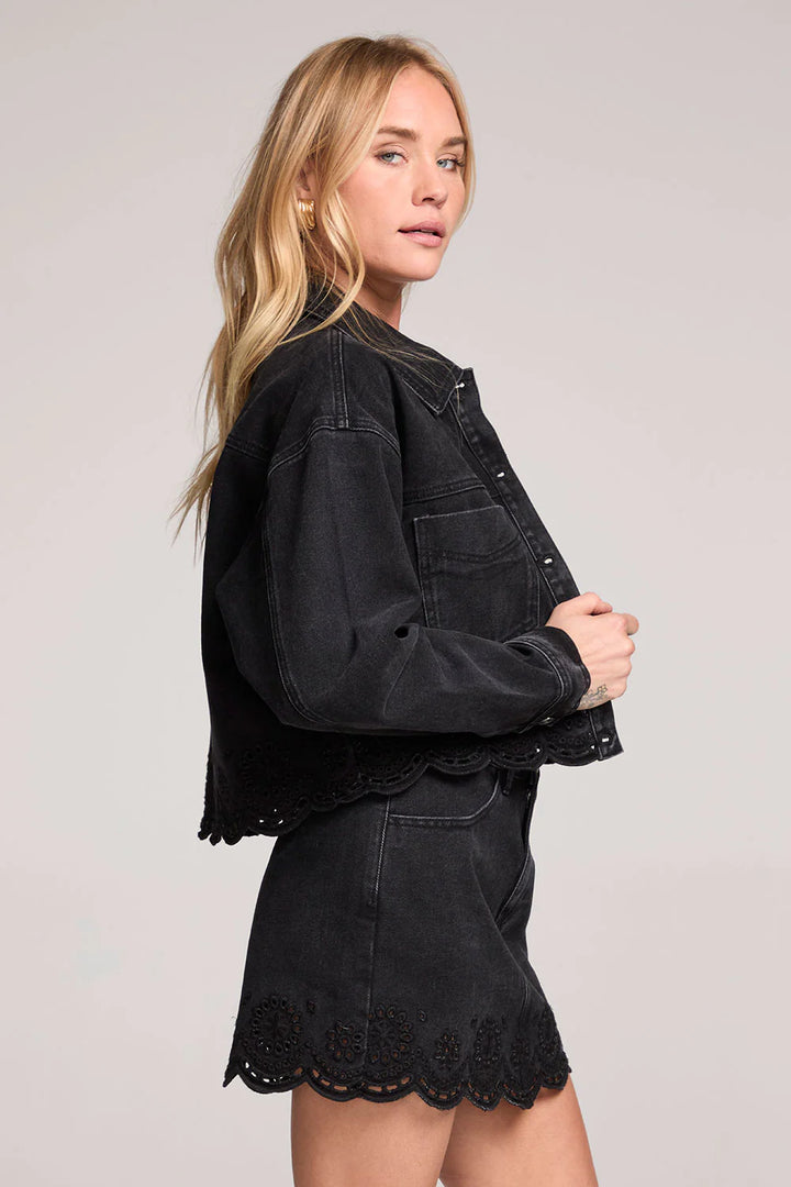 The Perrin Denim Jacket in washed black is a fun twist on a classic staple. Its cropped length and boxy fit create a modern, playful vibe, while patch pockets on the lapels and scalloped hem add charming details. This jacket effortlessly mixes simple sophistication with a touch of personality, making it perfect for layering over anything from your favorite tees to dresses. Add a little extra flair to your everyday look with this stylish, easy-to-wear piece.