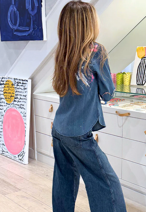 The Pia Western Studio Shirt brings Western charm with an artistic twist. Adorned with Kerri's hand-painted designs—think studio-worn authenticity—this medium indigo denim shirt combines snap-front convenience with practical pockets. Crafted from buttery-soft denim, it's your new go-to for layering magic. Throw it over a tank for relaxed vibes, snap it up for refined polish, or pair it with our Workday Blazer for a look that says "I'm creative and put-together." Pure denim joy.
