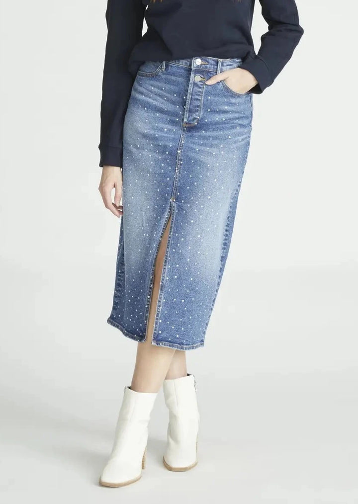 Add some sparkle to your wardrobe with our Piper X After Party skirt! Embellished with eye-catching sequins, it features a midi-length silhouette, a chic front slit, and plenty of comfort stretch. Versatile enough for any occasion, dress it up or down for a look that always turns heads.