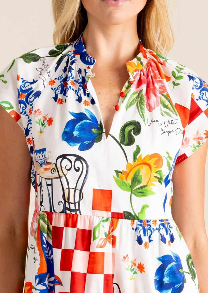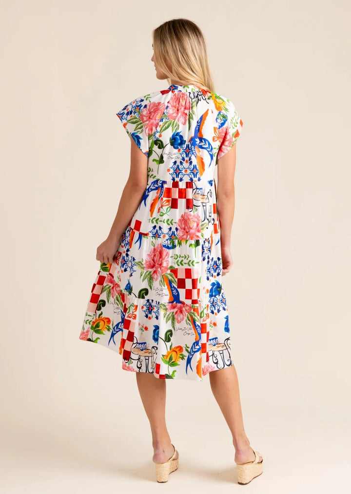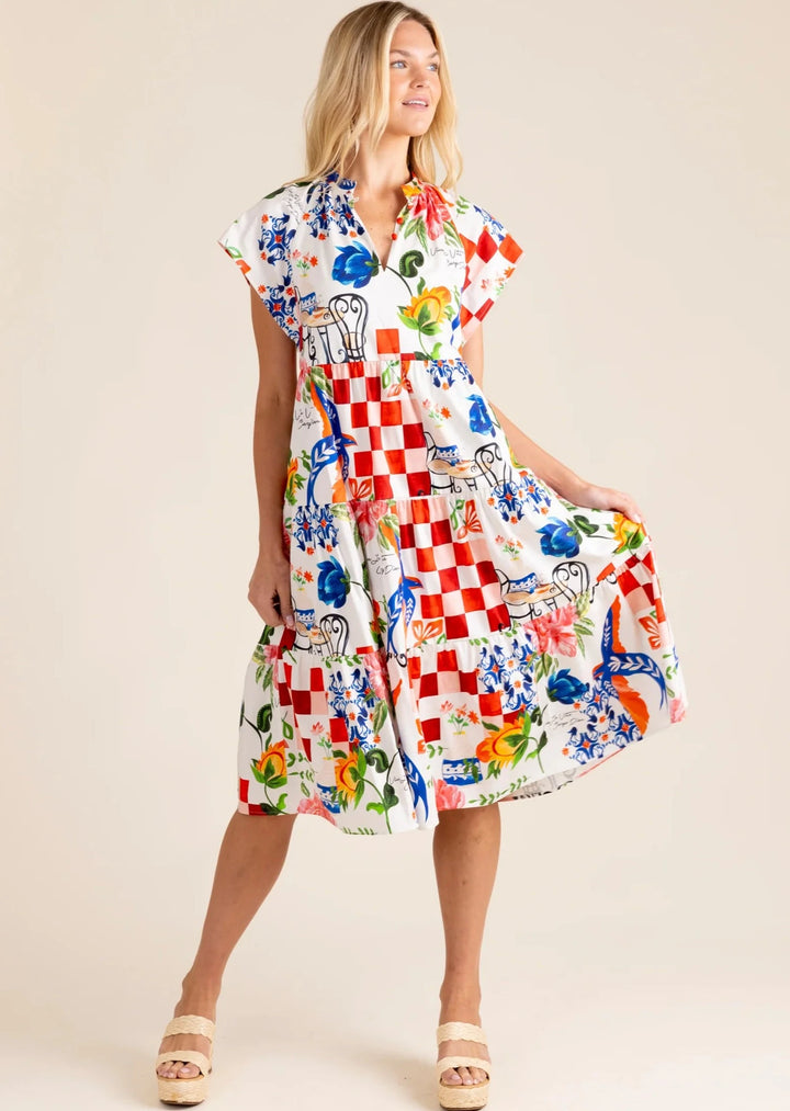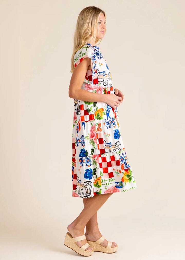 Get ready to make a statement in our Pippa Dress! The figure-flattering silhouette is adorned with a whimsical Amalfi print, featuring shades of red, blue, and yellow. The midi length and tiered skirt add a playful touch, while the cap sleeves and ruffle detail at the split v-neckline make for a perfect summer wedding or gathering outfit.