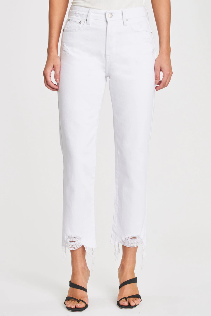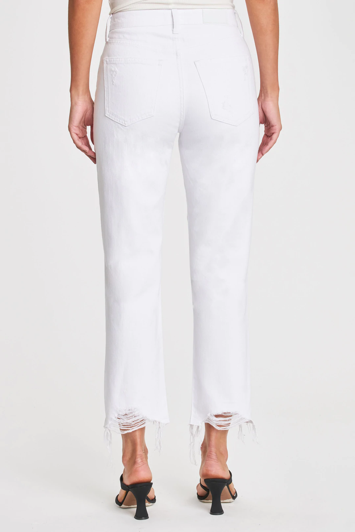White wash jean with hidden button fly and heavy fraying at hem. High rise straight leg is fitted at waist and hip and straight throughout. 11" front rise, 27" inseam, 14" leg opening. No stretch.