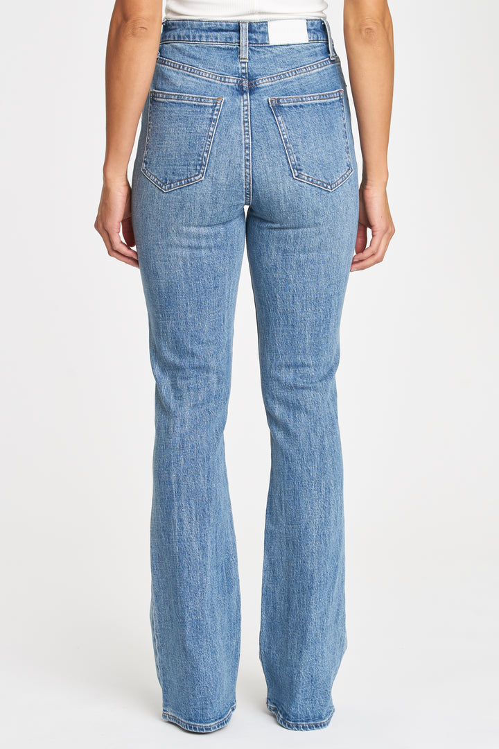 High-rise classic flare jean with exposed button closure. Comfortable light weight stretch denim. Size 26: 12" front rise, 32 1/2" inseam, 19" leg opening. Recommend choosing your normal denim size.
