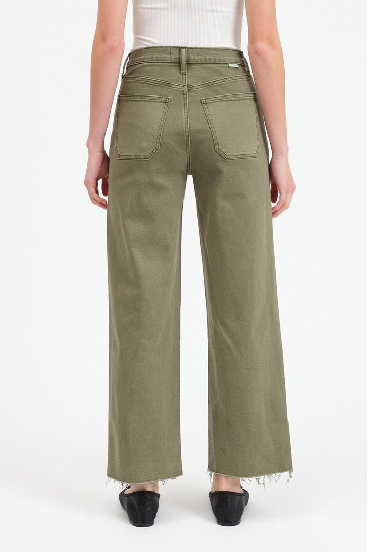 Elevate your style with Pleaser Patch Pocket Ankle Wide Leg pants. Made from comfortable stretch twill, these pants feature a warm olive green hue, patch pocket front, and a playful raw hemline. Perfect for transitioning from day to night with ease.