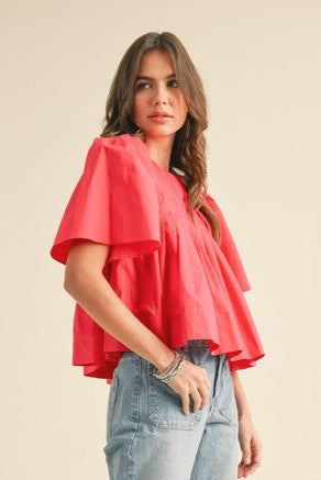 Effortlessly elevate your date night look with our Pleated Short Sleeve Blouse in Cerise Pink. The flared baby doll style top and cropped length round neck add a touch of playfulness, while the bright watermelon pink hue adds a pop of color. Perfect for a fun and flirty evening out.