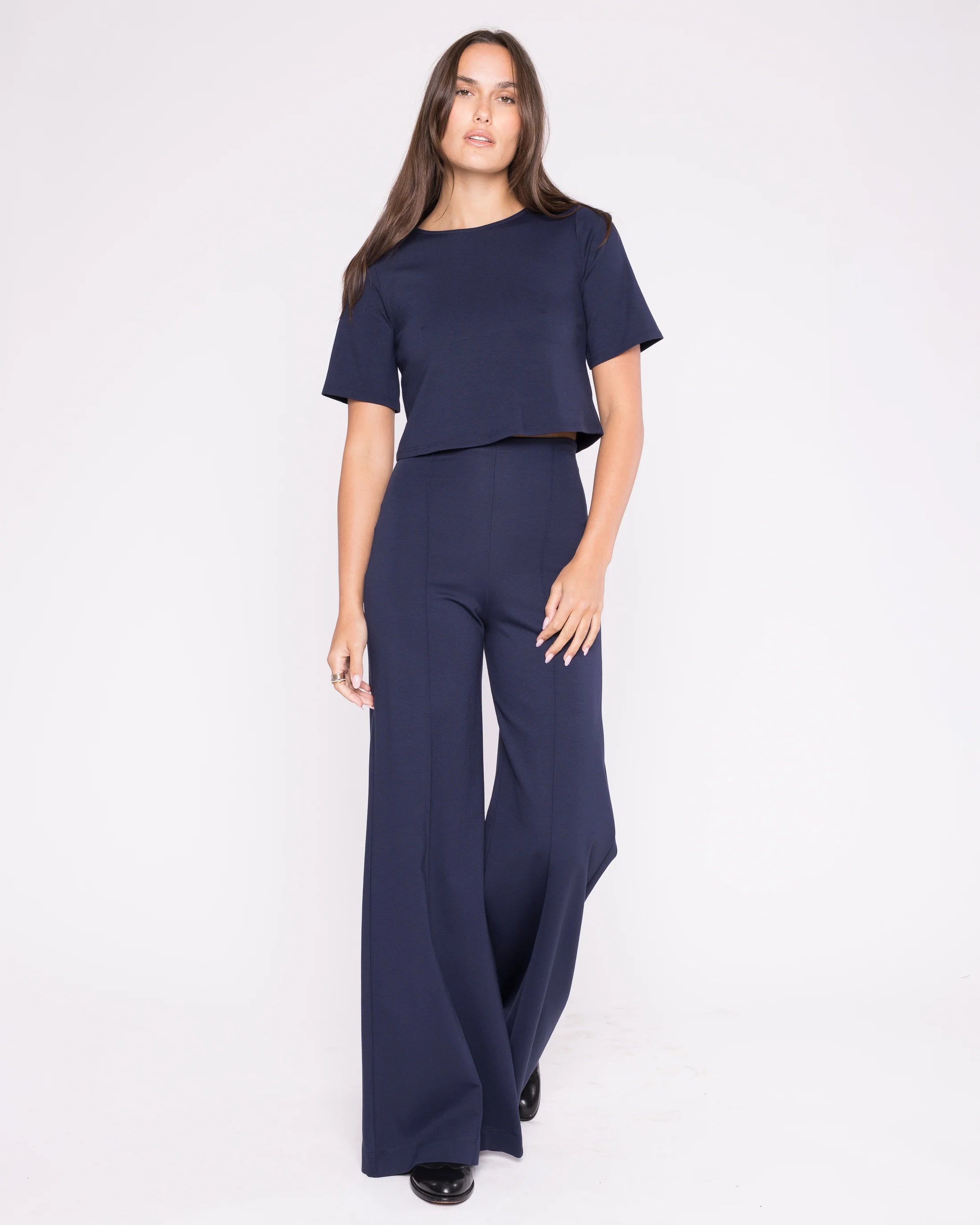 Structured elegance meets everyday comfort in this modern ponte knit top. Designed with a flattering square cut and natural waistline, it features tailored sleeves and a refined finish that transitions seamlessly from day to night. The signature luxe ponte fabric delivers crisp structure with soft stretch, pairing perfectly with our wide-leg silhouettes for a coordinated, polished look. Wear it tucked, layered, or solo—an essential capsule piece that moves with you.