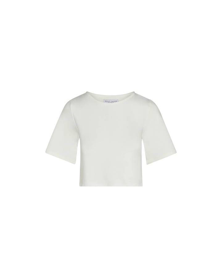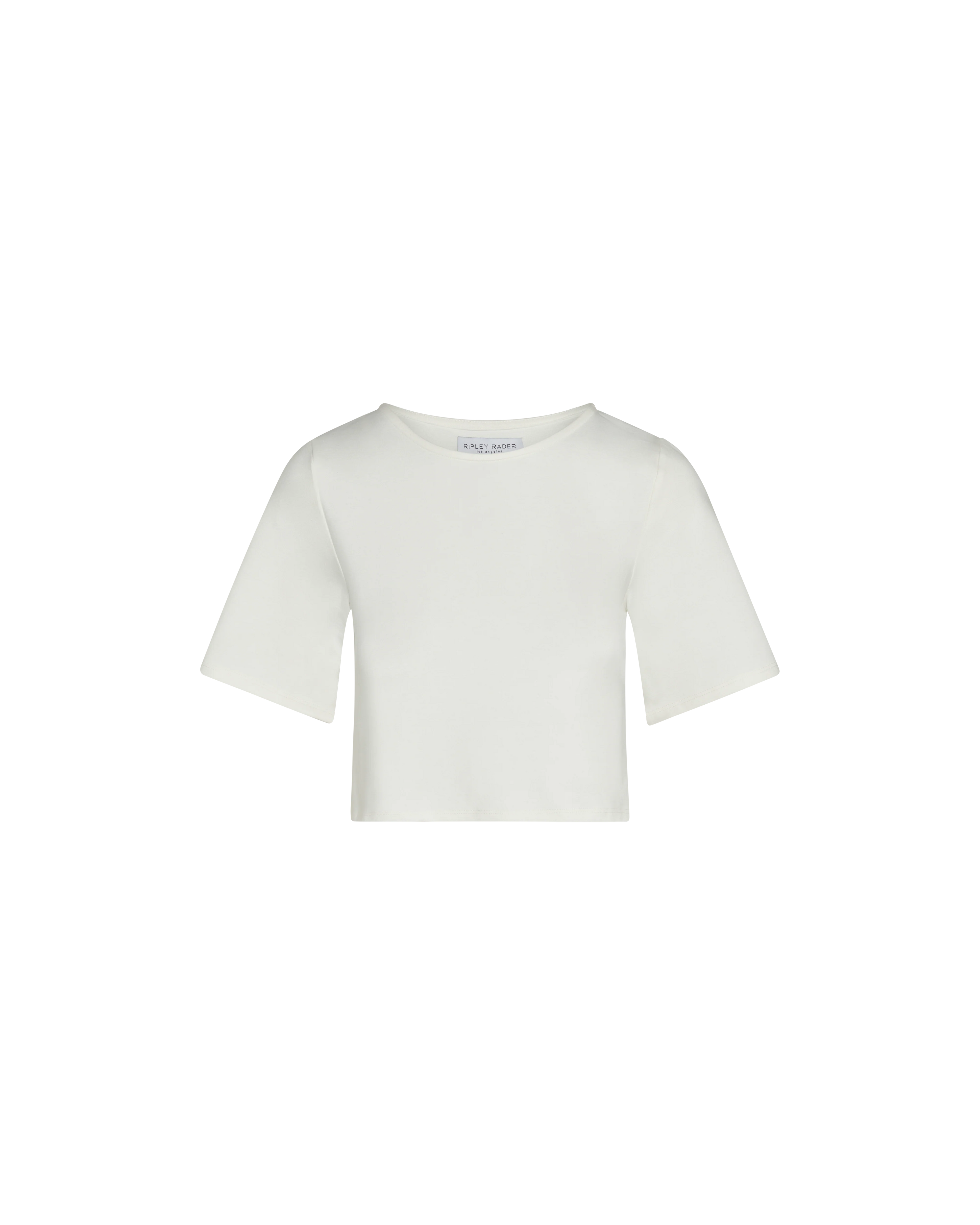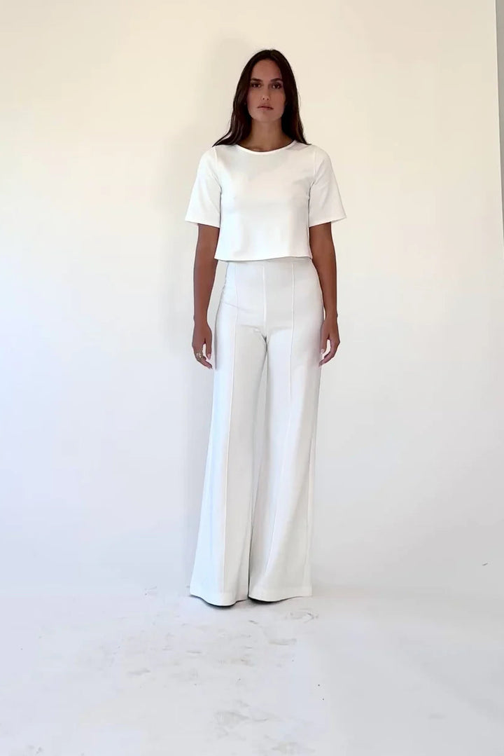 The Ponte Knit Short Sleeve Top in Off-White is a versatile wardrobe essential that seamlessly transitions from office to weekend. Its structured square neckline and tailored short sleeves create a polished silhouette, while the natural waist seaming provides subtle definition. The luxe ponte knit fabric offers the crisp appearance of tailored suiting with the comfort and breathability of a premium knit, making it ideal for all-day wear.Â