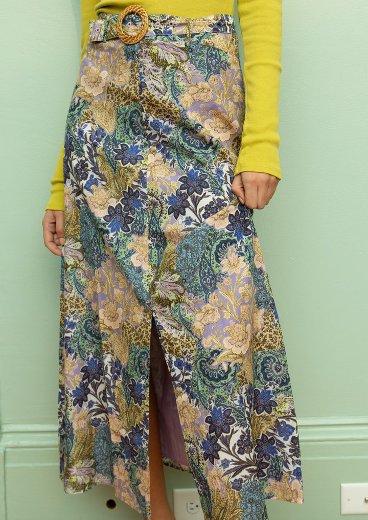 Effortlessly elevate your style with the Portia Skirt in Garden Party. Made from lightweight cotton that feels luxuriously soft like silk, this wardrobe staple features a hidden front slit and an optional belt for a tailored fit. Perfect for any occasion, it's a must-have for the fashion-forward.
