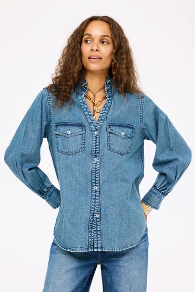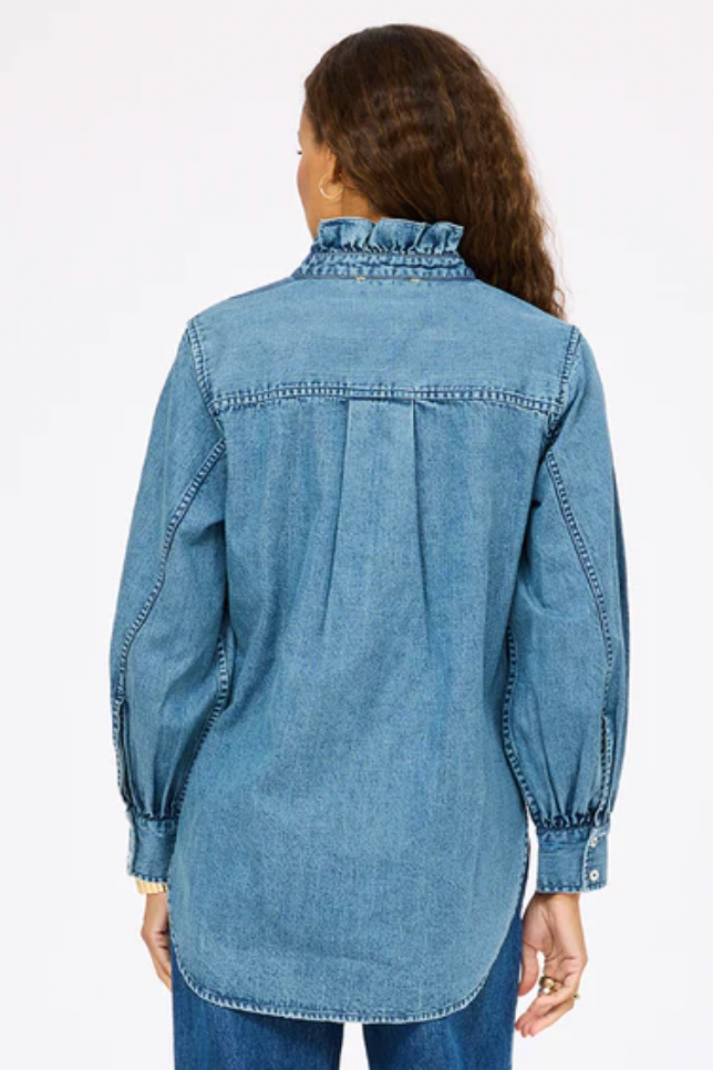 Introducing the Puff Sleeve Denim Shirt—your new go-to for effortless style. Crafted from 100% cotton denim in a flattering mid-blue shade, this versatile piece features statement puff sleeves, a charming ruffled neckline, and a subtle V-neck opening that adds just the right amount of flair. With a button front and dual pockets, it's equally at home paired with jeans for weekend vibes or layered under our Workday blazer for polished office energy. Made in India with quality construction that lasts. Dress it up, dress it down—this shirt does it all.