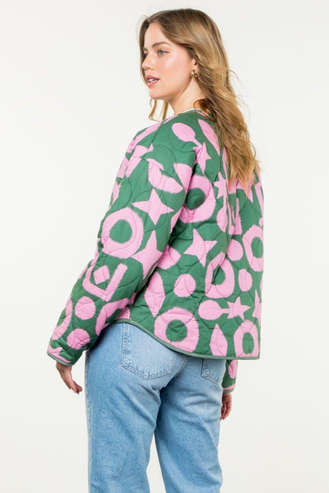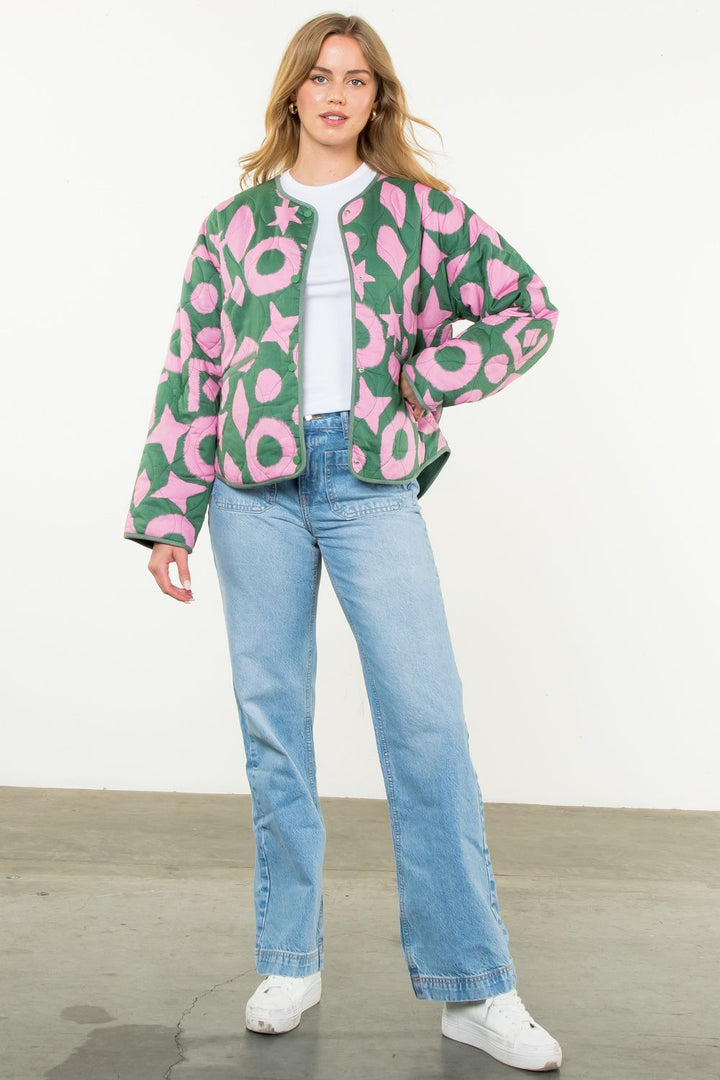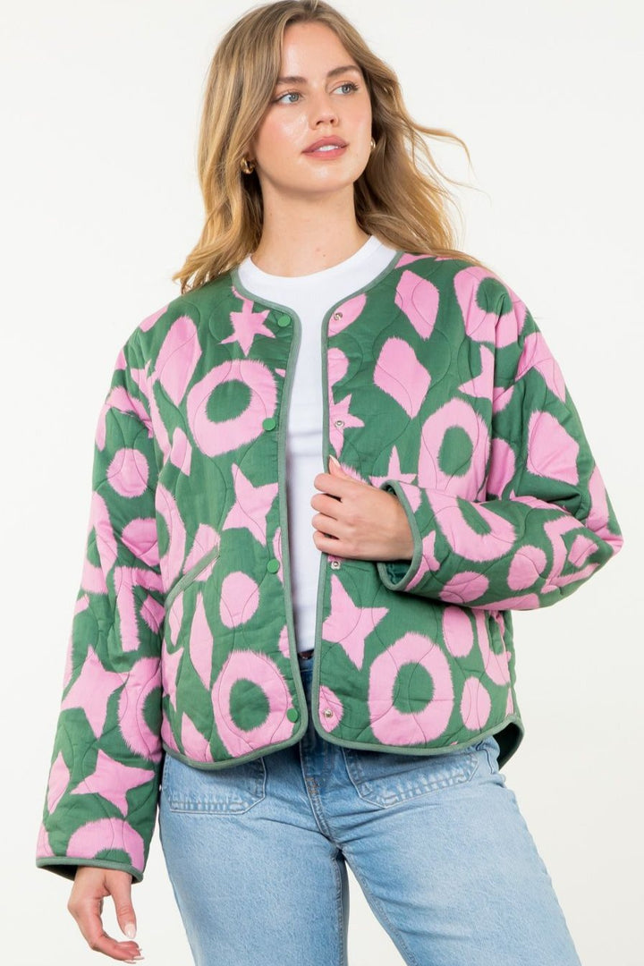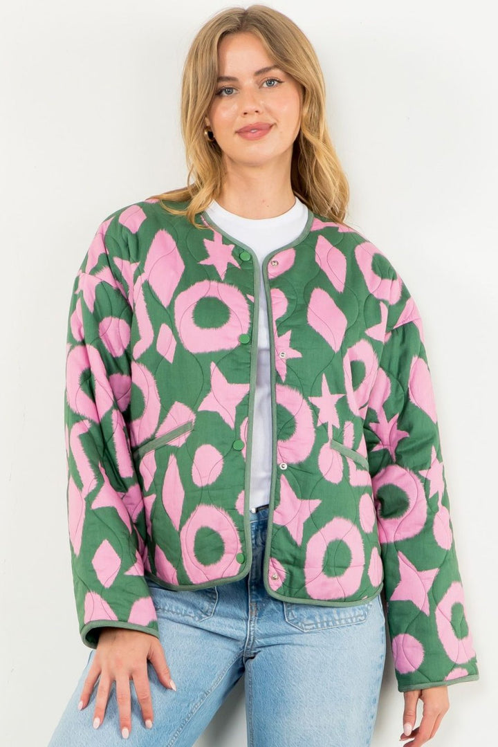 This lightweight and versatile jacket features a boxier fit, snap front, and side pockets. The sage green color with pink accents adds a playful touch. Dress it up or down for any occasion.
