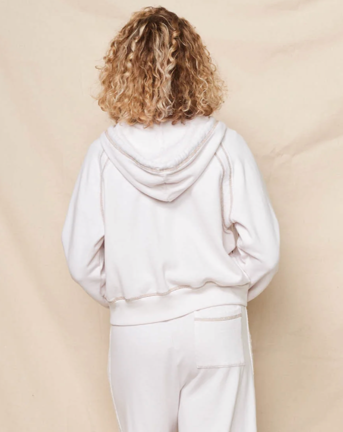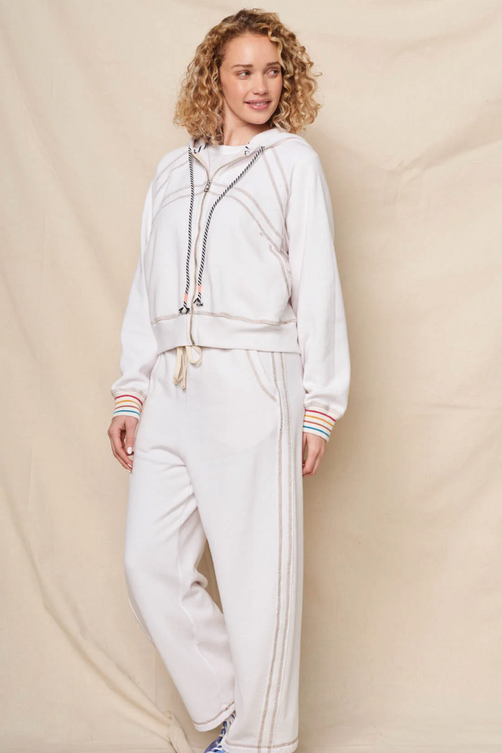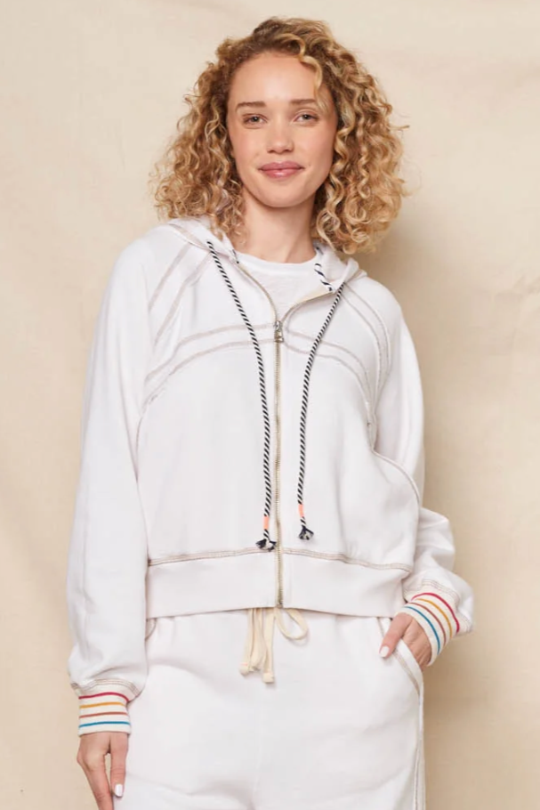 Stay cozy and stylish in the Raw Seamed Horizon Hoodie–Oyster. Featuring eye-catching exposed seams and a relaxed, slightly cropped shape, this hoodie delivers a laid-back vibe. Sporty contrast striped cuffs and natural drawstrings bring a fun retro touch, making it perfect for casual adventures or lounging at home. Crafted from a comfy cotton-poly blend and proudly made in the USA, it’s the hoodie you'll want to zip up every day.
