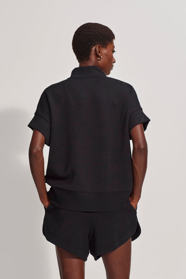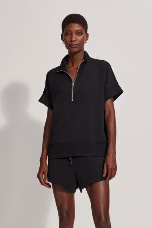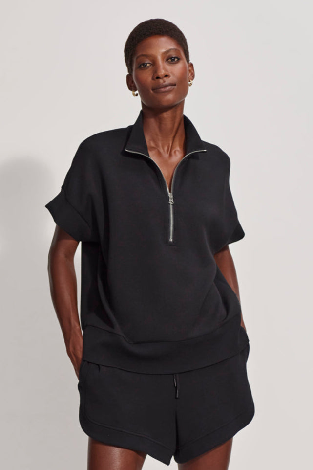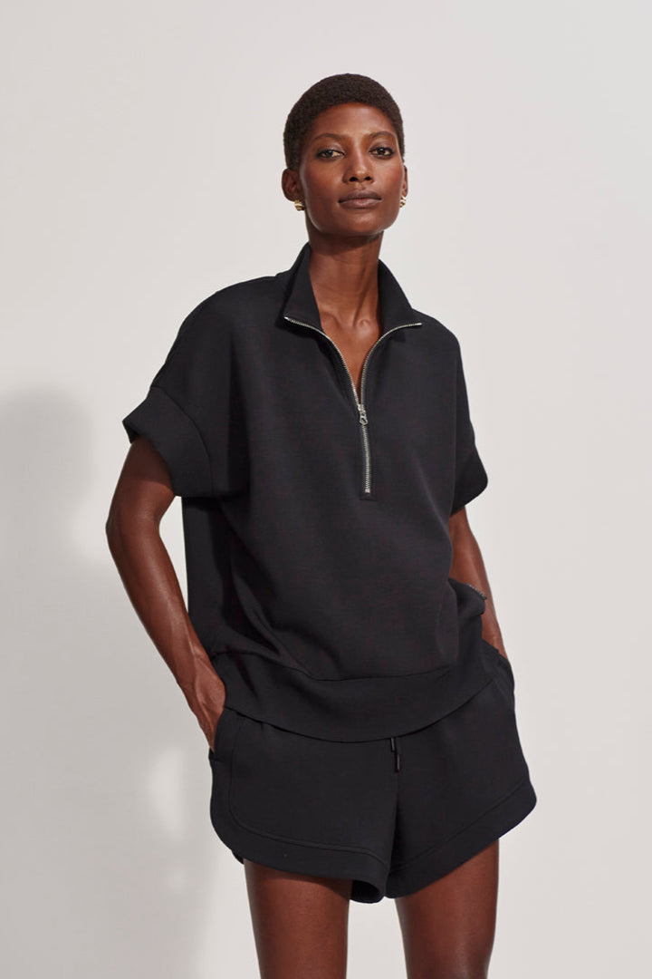 The Ritchie Short Sleeve Sweatshirt in Black offers effortless style with its relaxed fit, short sleeves, and half-zip design. Made for comfort, it features a mock neck and pairs perfectly with Varleys matching shorts and pants for a complete look.