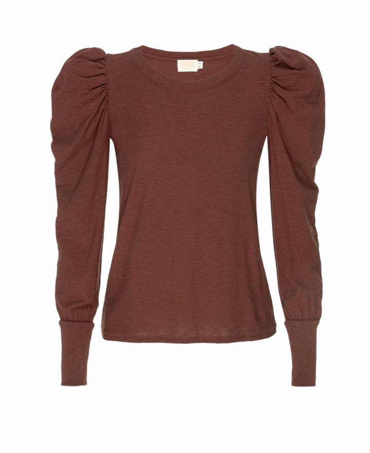 Lightweight long sleeve cotton tee with romantic puffed shoulders. Open crew neckline and straight fit through body. Easy elevated basic to add to your wardrobe.