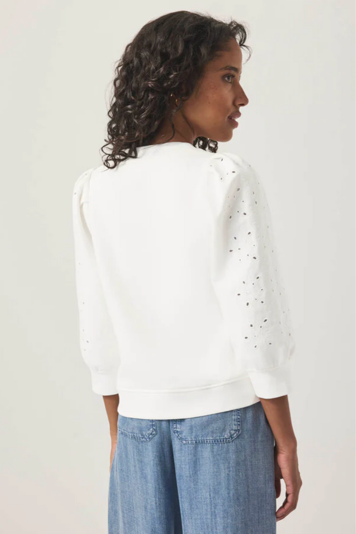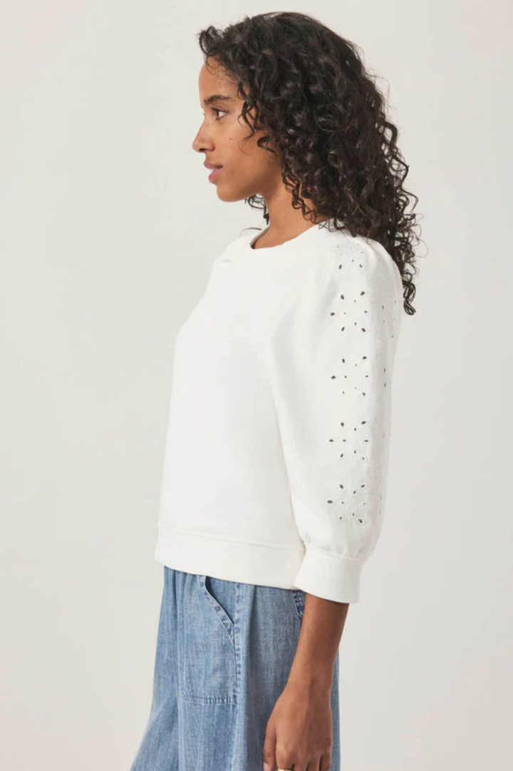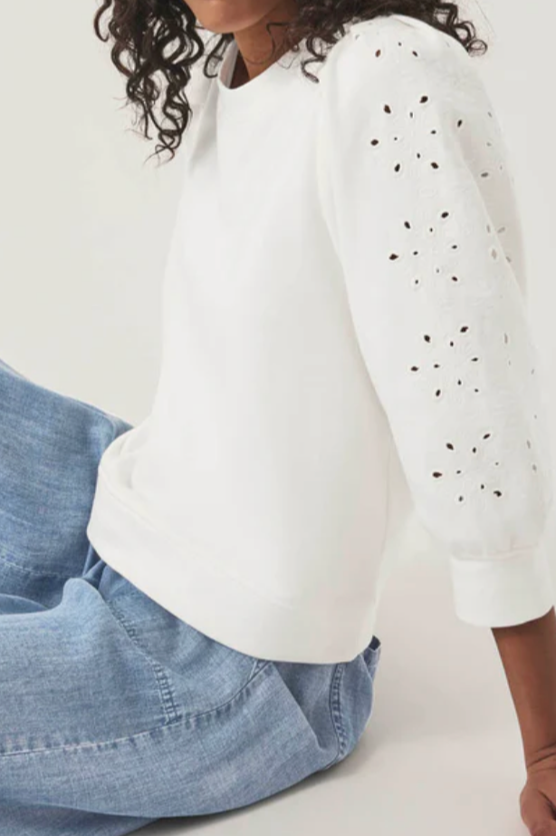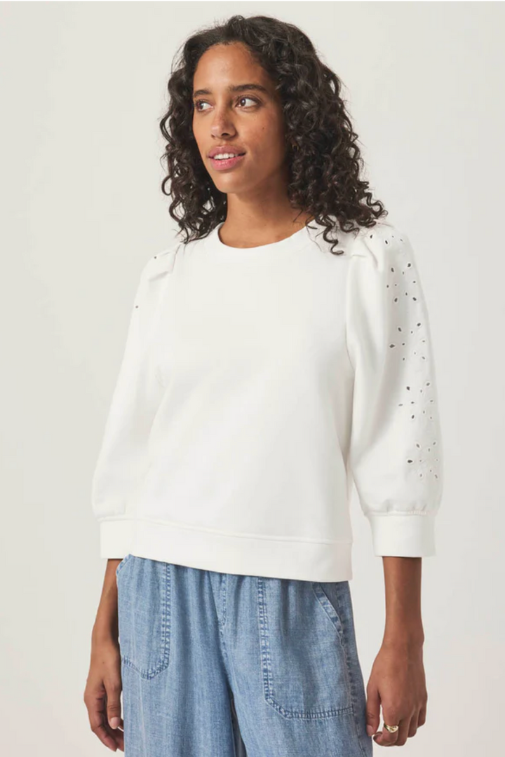 Upgrade your sweatshirt game with the Rory Embroidered Sweatshirt. Made from soft French terry, this cozy pullover features delicate eyelet designs on the three-quarter length puff sleeves for a feminine touch. With a crewneck, banded cuffs and hem, and a slightly elevated look, this top is perfect for everyday wear.