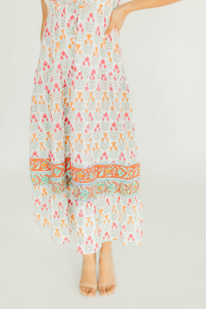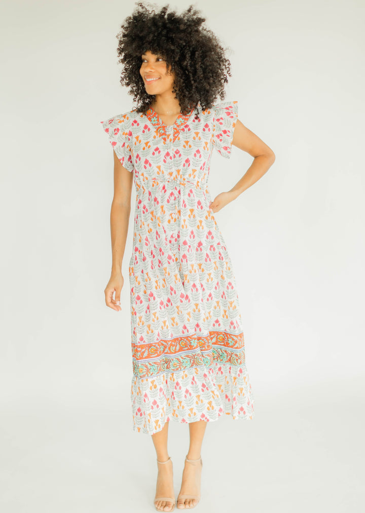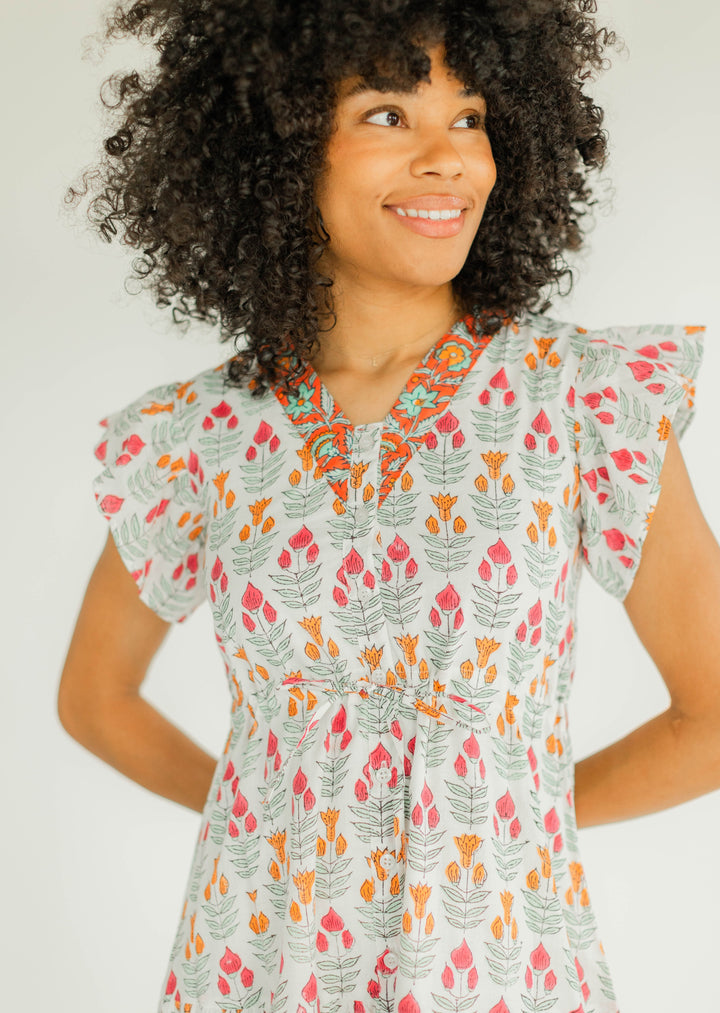 The Rosa features a v-neckline, short flutter sleeves, contrasting trim, top to bottom buttons, and an adjustable tie waist.