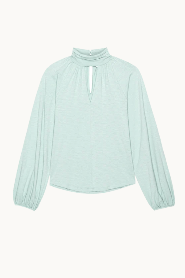 Effortlessly elegant. The Rosalie Keyhole Blouse in Sea Frost offers a keyhole mock neckline, raglan shoulders, and signature gold snaps for a touch of luxury. Easy to wear, this blouse transitions seamlessly from day to night.