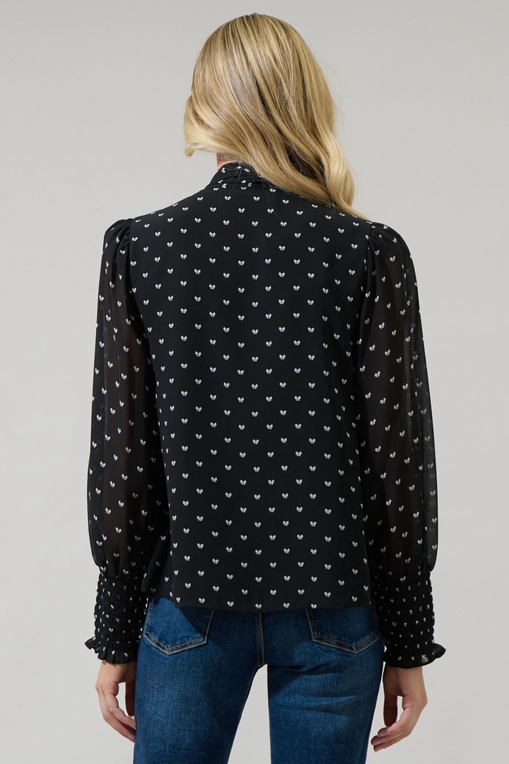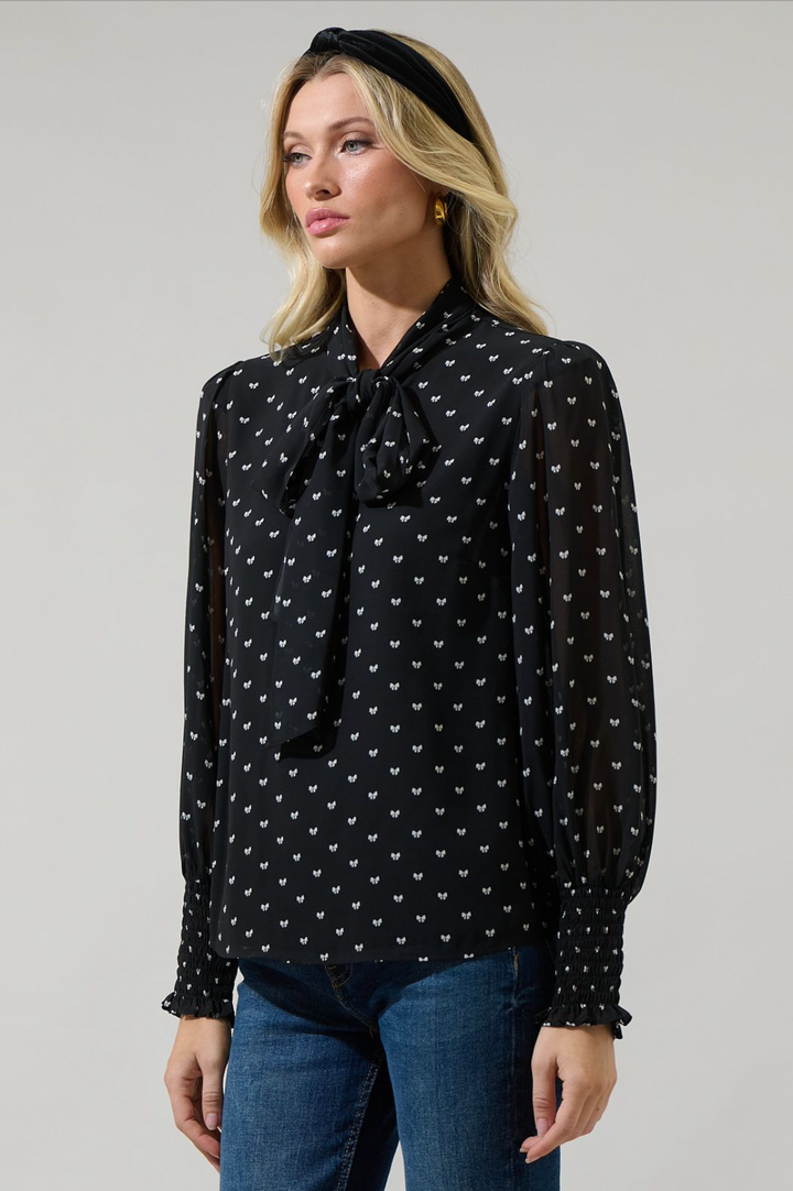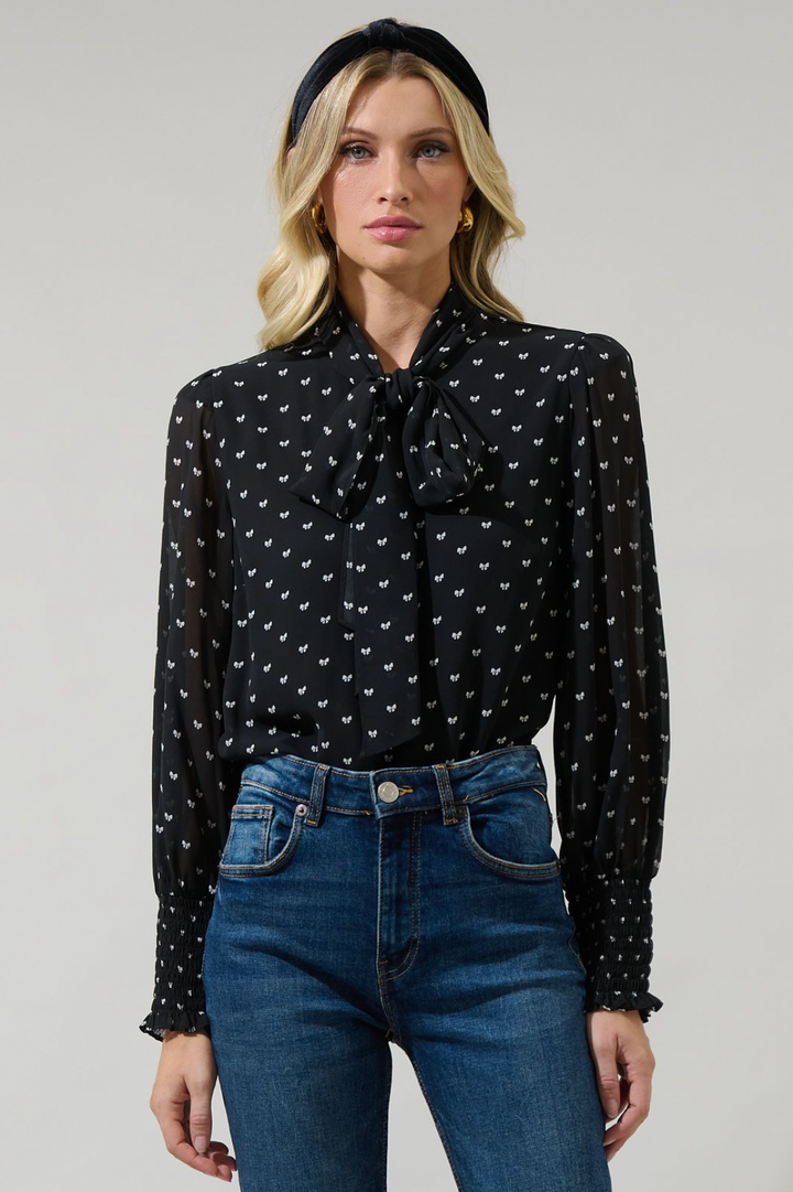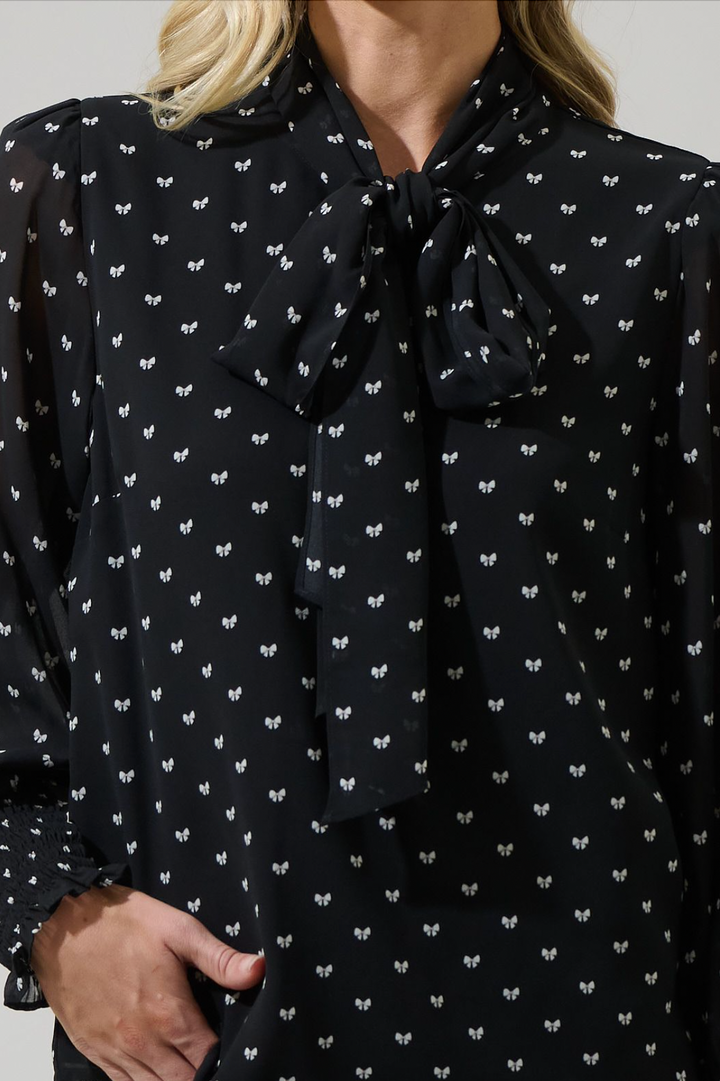 The Rosaly Bow Etienne Tie Neck Long Sleeve Blouse is a versatile and stylish addition to any wardrobe. Made of chiffon and lined, it features a mock neck tie detail and smocked cuffs for an elegant touch. Perfect for dressing up with black pants or dressing down with jeans.
