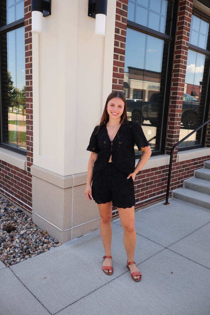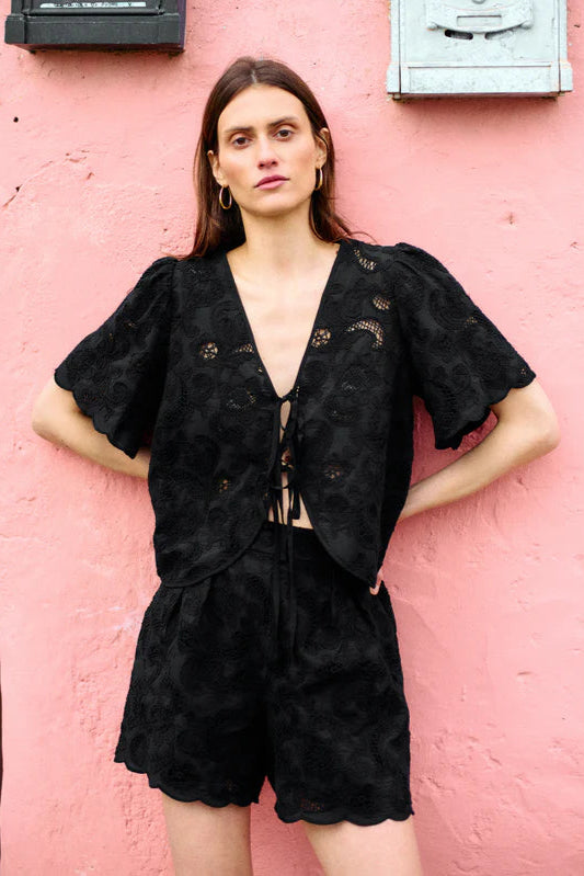 The Rosalyn Tie Front Top in black offers a sophisticated update to a beloved vintage style. Crafted from embroidered cotton voile, this cropped blouse features delicate bell sleeves with scalloped edges and a semi-sheer lace texture. Its v-neckline with a tie front closure adds a feminine touch while allowing adjustable fit. Perfectly versatile, it pairs effortlessly with tailored shorts or skirts for a polished yet relaxed look.