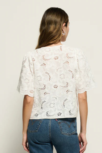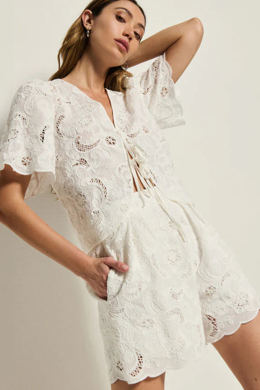 The Rosalyn Tie Front Top in white offers a sophisticated update to a beloved vintage style. Crafted from embroidered cotton voile, this cropped blouse features delicate bell sleeves with scalloped edges and a semi-sheer lace texture that adds subtle elegance. Its v-neckline with a tie front closure enhances femininity while allowing adjustable fit. Perfectly versatile, it pairs effortlessly with the Archer Short for a polished, season-ready look.