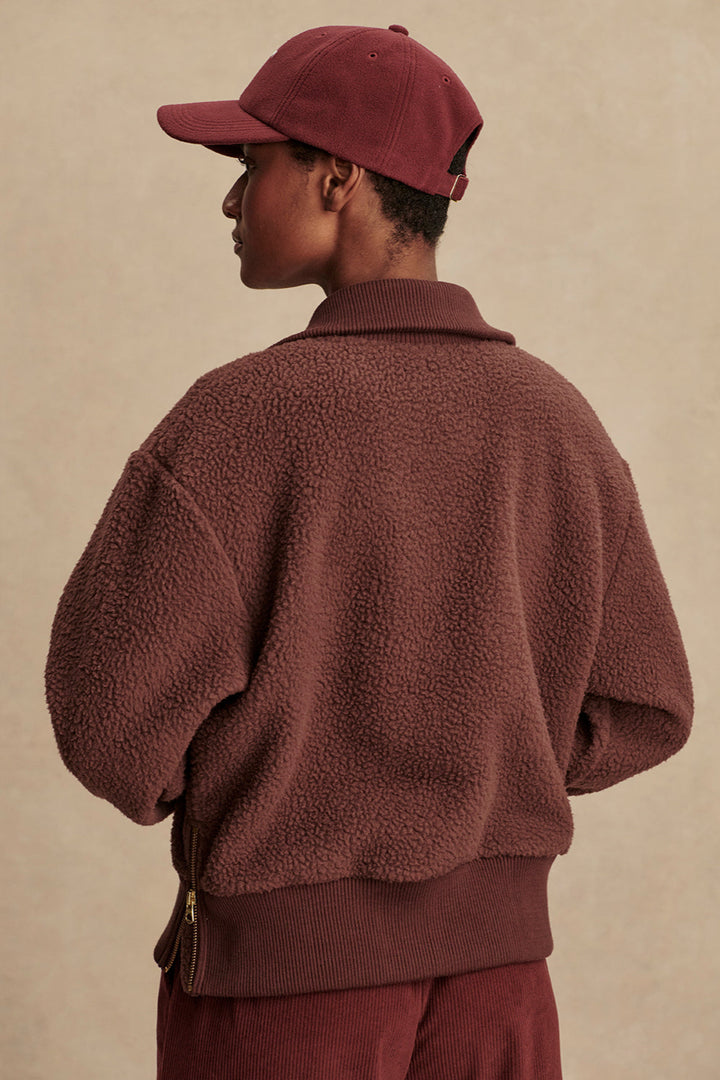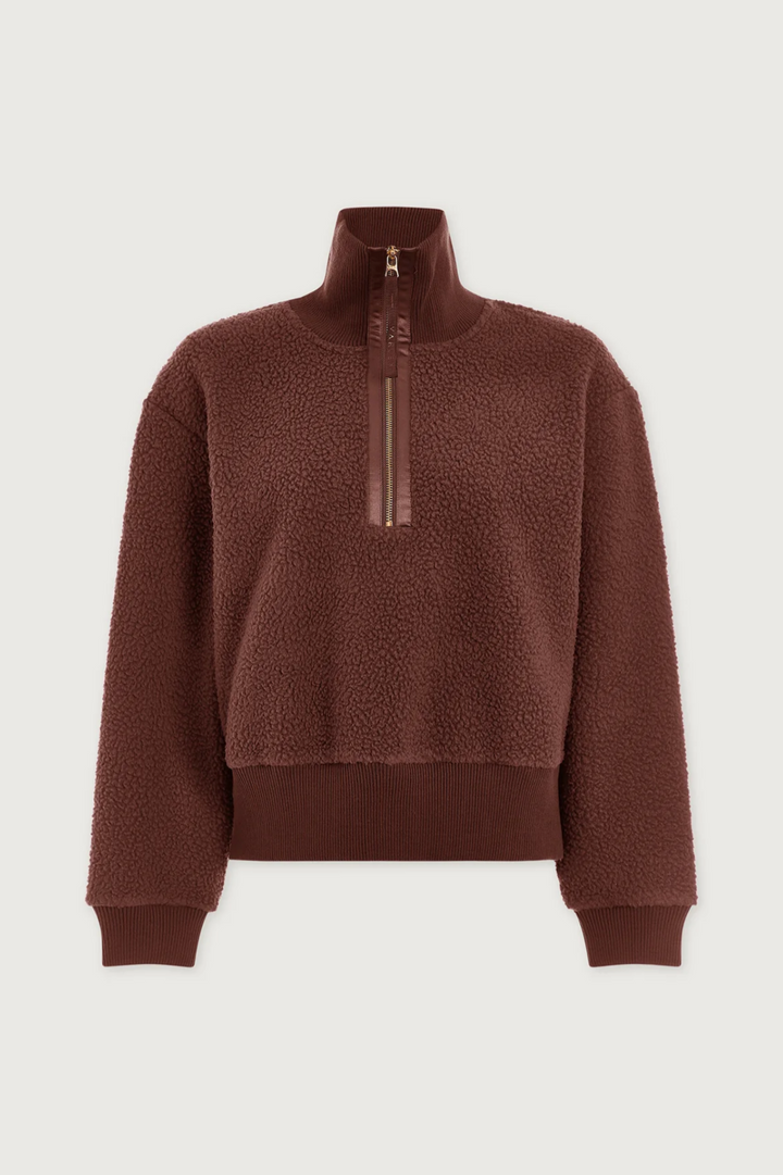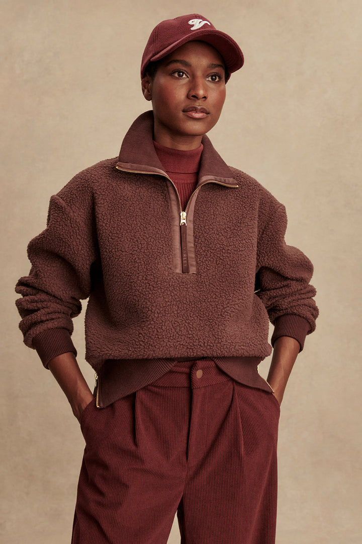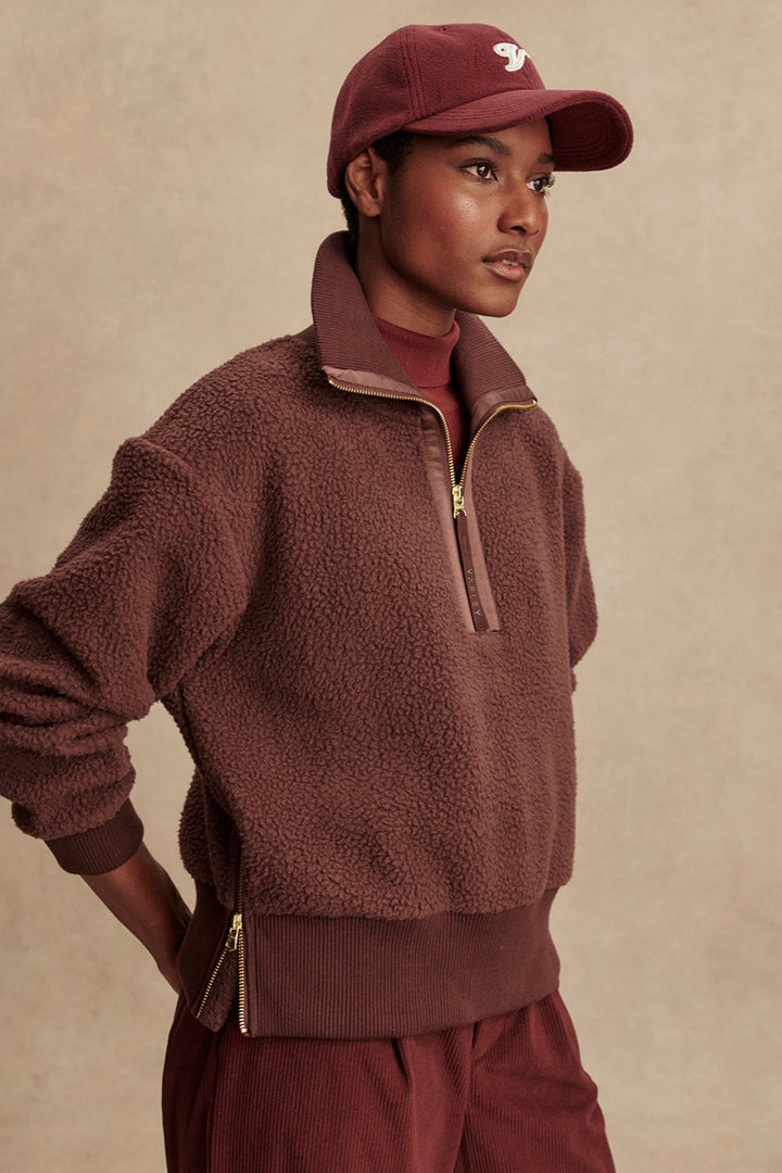 Cozy meets cool in our Roselle Half Zip Fleece in Deep Mahogany. Crafted from 100% recycled plush borg fleece, it features a half-zip collar perfect for quick warmth changes, ribbed cuffs, and roomy sleeves for ultimate comfort. Eye-catching side zip details and a luxe sateen trim add a fun twist to your casual look. Ready to zip into your new favorite fleece?