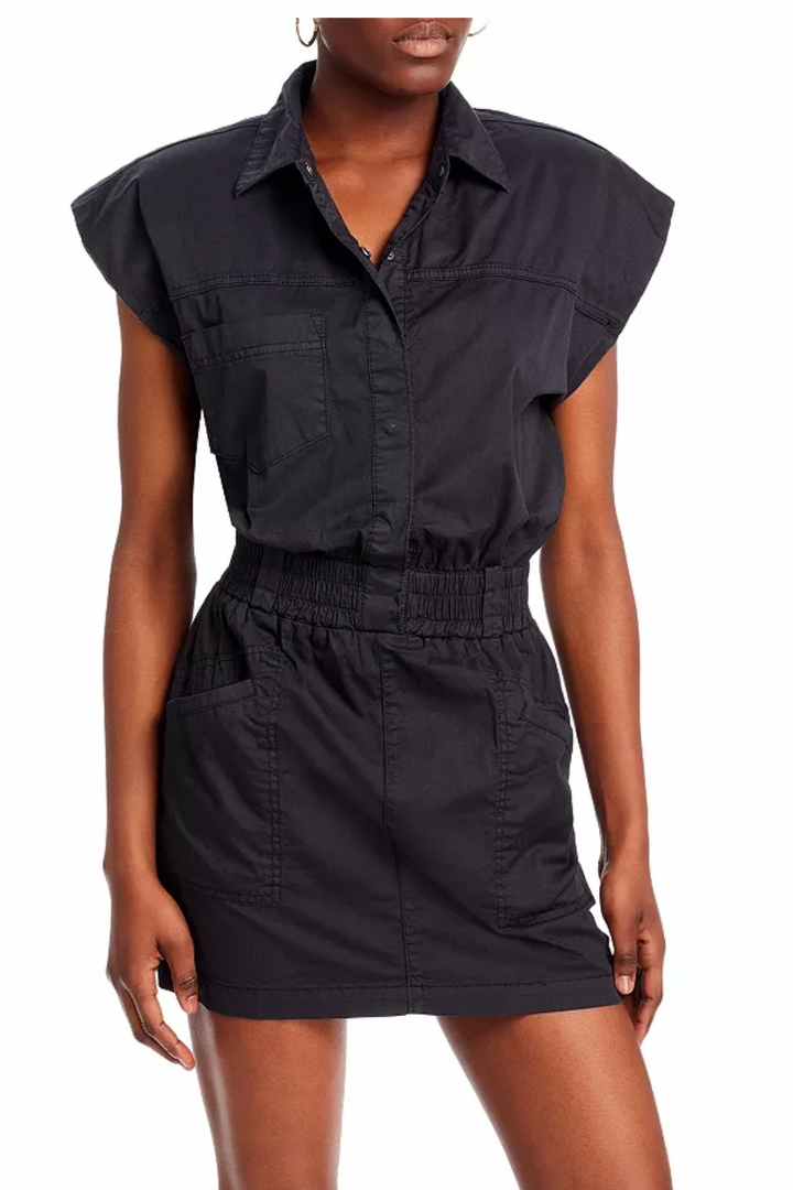 Love the dramatic style of this smocked waist black mini dress. Featuring bold cap sleeves, spread collar, button front and patch pockets. Dress it up or down by just changing your shoes and accessories. Approx. 27" from shoulder to hemline.