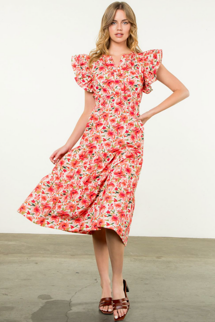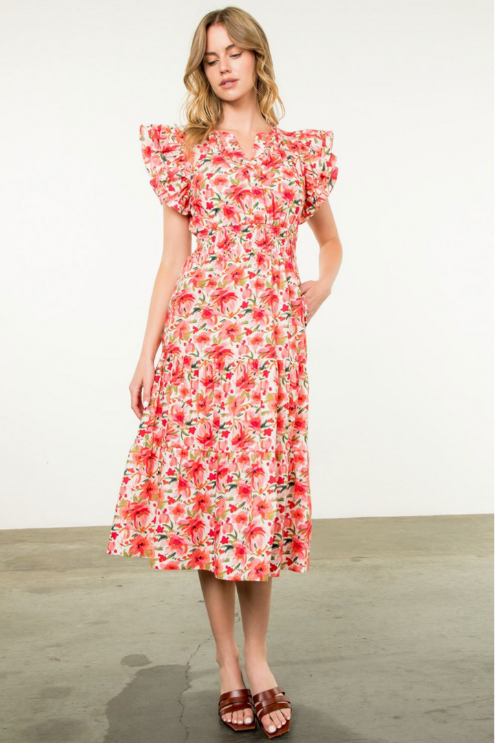 Elevate your style with our new Ruffle Sleeve Floral Midi Dress in Red/Cream! This figure-flattering dress boasts a bright floral print and features a v-neckline, ruffle sleeves, and a tiered skirt. With added pockets for convenience, this dress is perfect for any occasion.